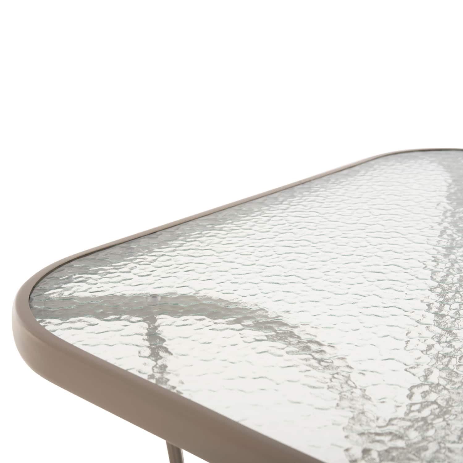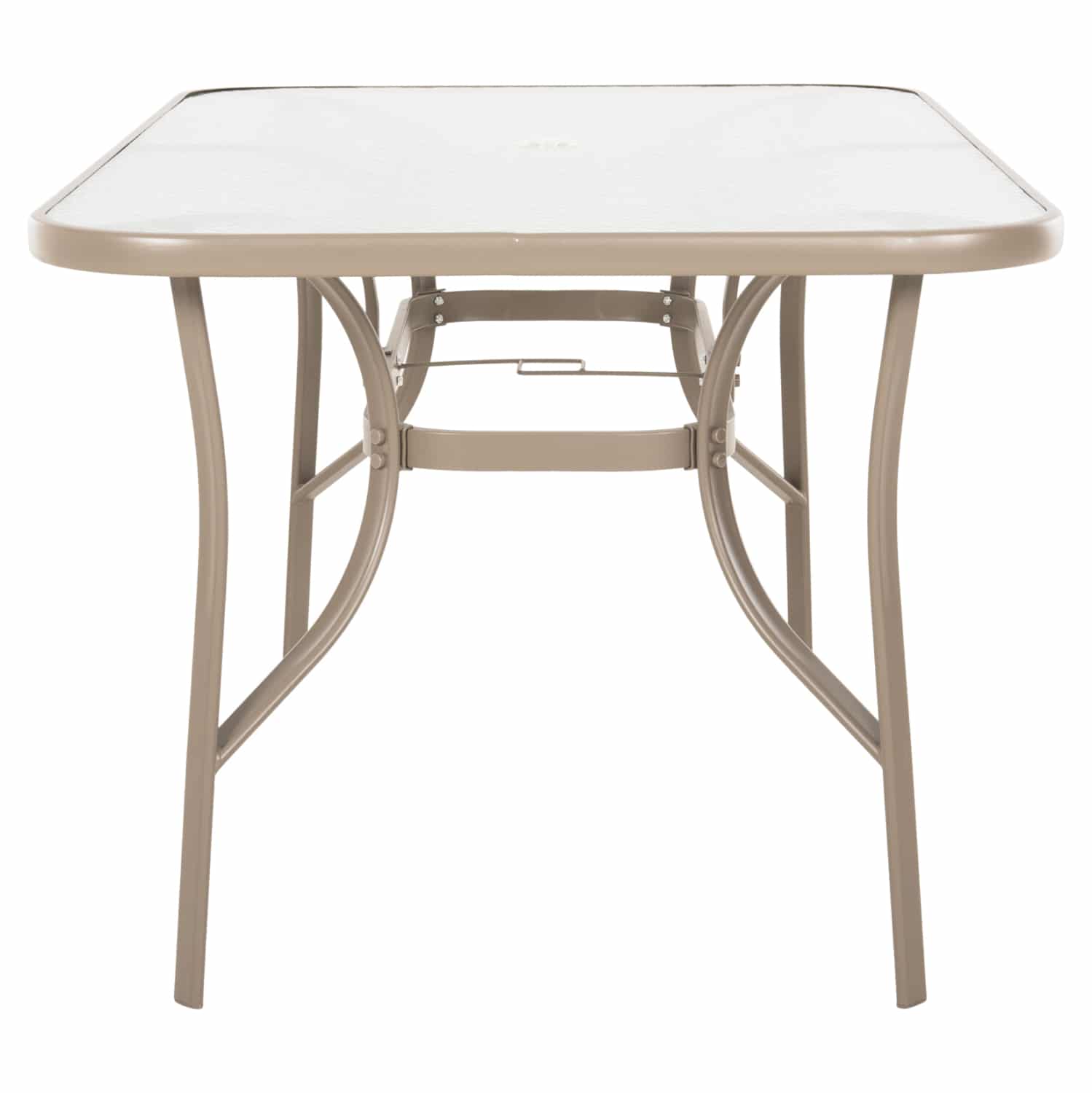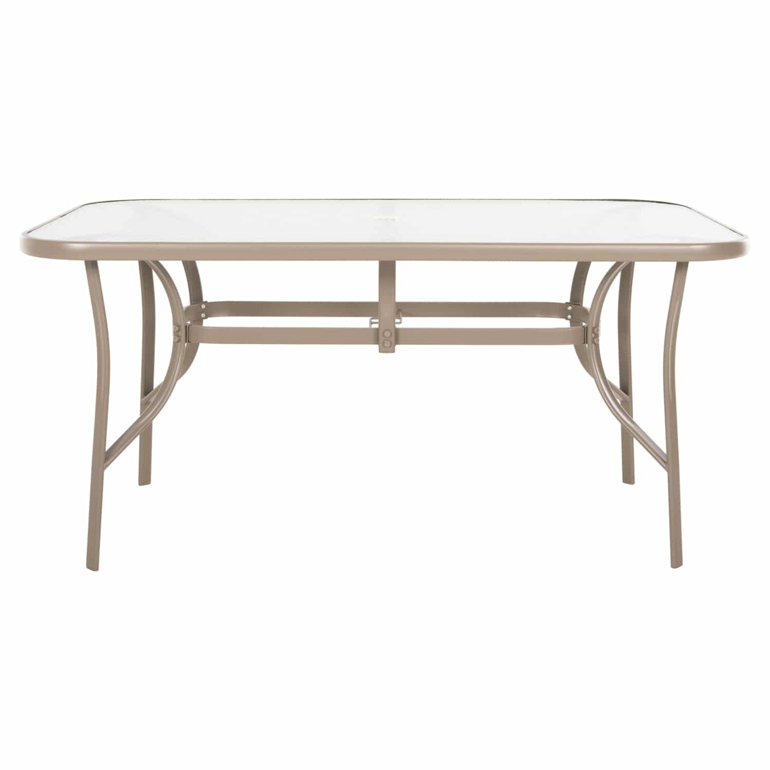 Τραπέζι BRUNO εξωτερικού χώρου με ΣΑΜΠΑΝΙ μεταλλικό σκελετό και γυάλινη θολή επιφάνεια! Πρόκειται για πολύ δημοφιλές τραπέζι που δεν λείπει σχεδόν από κανέναν μπαλκόνι ή κήπο. Είναι ορθογώνιο με γωνίες στρογγυλεμένες ενώ το γυαλί της επιφάνειας είναι ενισχυμένο. Το συγκεκριμένο μάλιστα έρχεται και με τρύπα στο κέντρο για τοποθέτηση ομπρέλας.