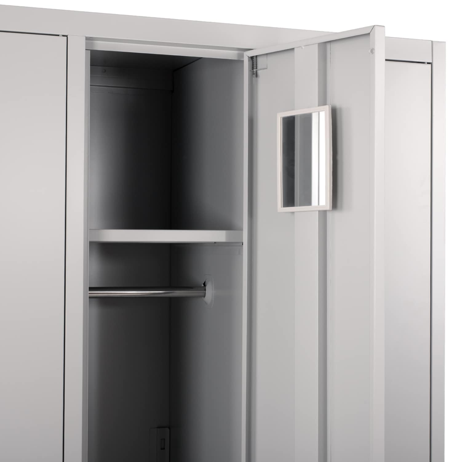 Το κάθε ντουλάπι διαθέτει έναν καθρέφτη στην πόρτα του, δύο ράφια και ένα μεταλλικό δοκάρι ειδικά κατασκευασμένο για κρέμαση ρούχων.