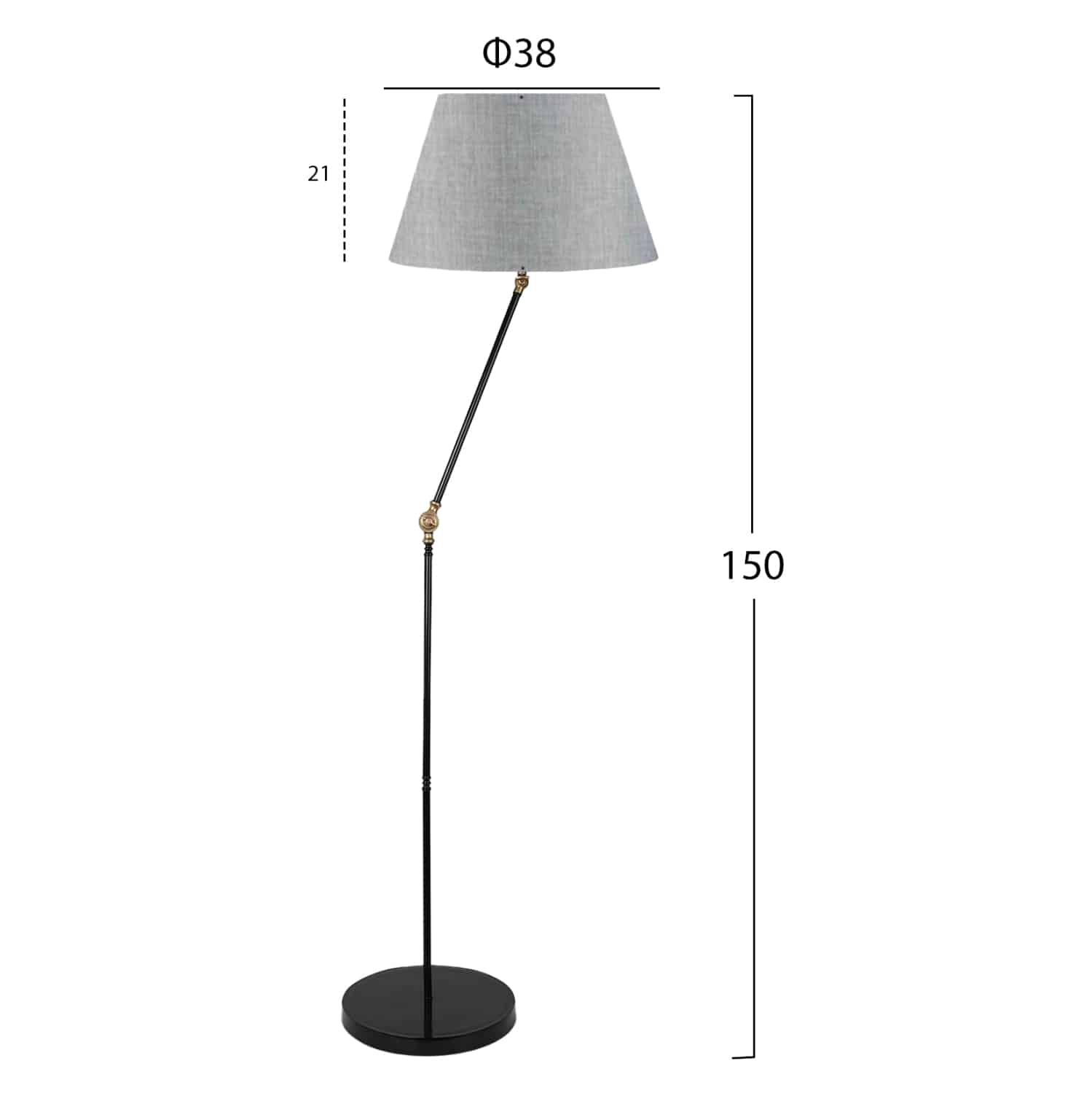 Φωτιστικό δαπέδου με μονή μεταλλική ράβδο σε μαύρο χρώμα. Το χαρακτηριστικό της μεταλλικής κολώνας είναι ότι είναι σπονδυλωτή κάνοντας ένα «σπάσιμο», κρατώντας ταυτόχρονα το «καπέλο» σε όρθια θέση μέσω και δεύτερου «σπασίματος». Το «καπέλο» του φωτιστικού έχει σχήμα ανοιχτής καμπάνας σε γκρι χρώμα, ενώ η βάση στήριξης είναι μαύρη και κυκλική. Ένα λιτό και κομψό φωτιστικό δαπέδου που διαχέει γλυκά το φως και δημιουργεί την ατμόσφαιρα που πάντα φανταζόσασταν για τον χώρο σας, έτσι ώστε να φτιάξετε την δική σας γωνιά χαλάρωσης ή ακόμα και διακόσμησης. Διότι το φως, σημαίνει κάτι περισσότερο από ένα φωτιστικό. Σημαίνει διακόσμηση, ατμόσφαιρα, τέχνη, μεράκι, και φυσικά επιστήμη.