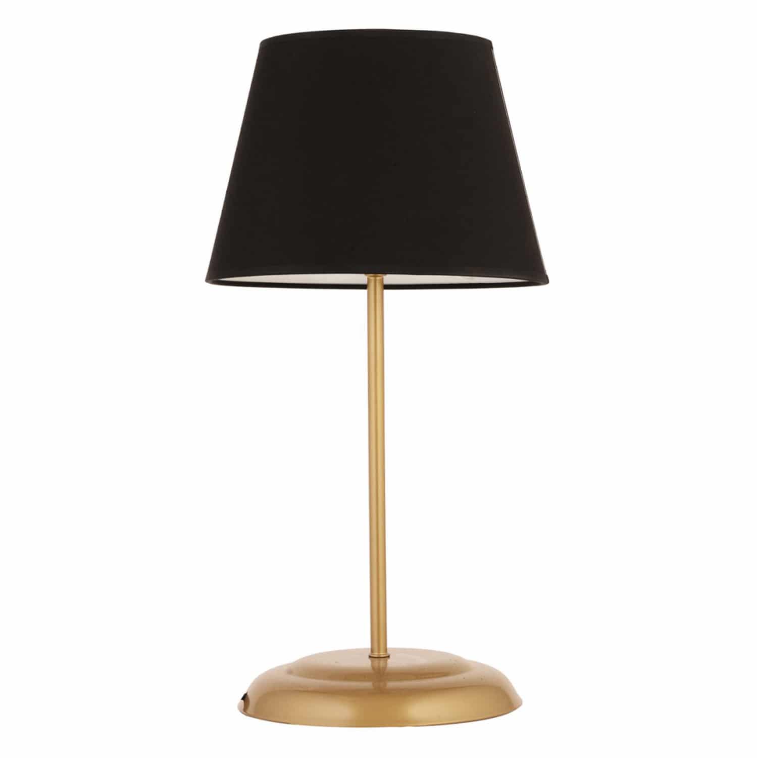 Επιτραπέζιο φωτιστικό, σε χρυσή απόχρωση με μαύρο καπέλο.