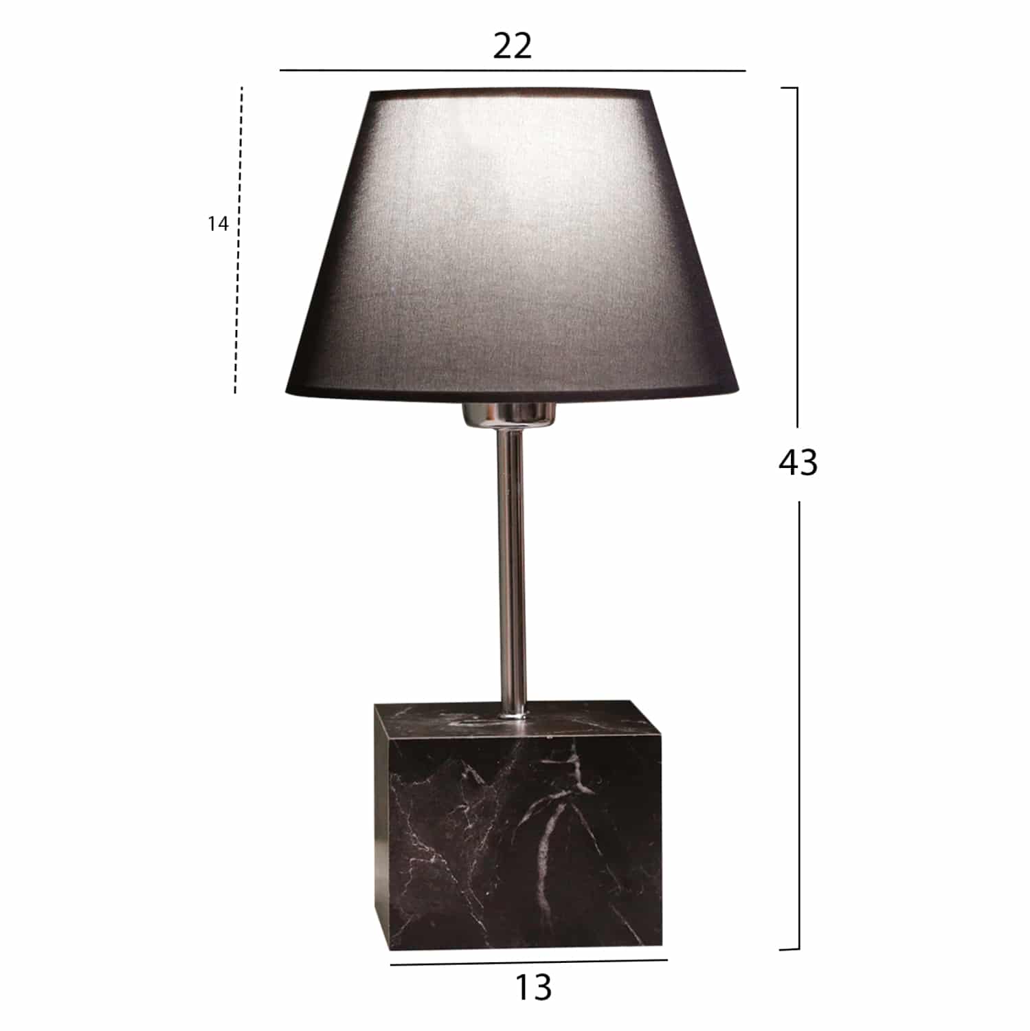 Επιτραπέζιο διακοσμητικό φωτιστικό με μονή κολώνα. Η βάση του φωτιστικού έχει το σχήμα κύβου με όψη ανθρακί μαρμάρου ενώ η κολώνα είναι σε χρυσό χρώμα. Το «καπέλο» έχει τραπεζοειδές κυκλικό σχήμα σε μαύρο χρώμα. Το φως διαχέεται στον χώρο ευχάριστα και η αντανάκλασή του πάνω στην χρυσή κολωνίτσα του φωτιστικού αλλά και στην κυβική βάση, παιχνιδίζει ευχάριστα στο μάτι. Αυτού του είδους τα φωτιστικά δεν προορίζονται για φωτιστικά διαβάσματος και αυτό πρέπει πάντα να λαμβάνεται υπόψη κατά την επιλογή τους. Είναι καθαρά διακοσμητικά και το ταίριασμά τους με τον περιβάλλοντα χώρο θα πρέπει να είναι αρμονικό. Αυτό το φωτιστικό είναι κομψό και βολικό σε διαστάσεις παρέχοντας αμέτρητες δυνατότητες «δεσίματος» με την υπόλοιπη διακόσμησή σας. Είναι ένα μικρό έργο τέχνης.