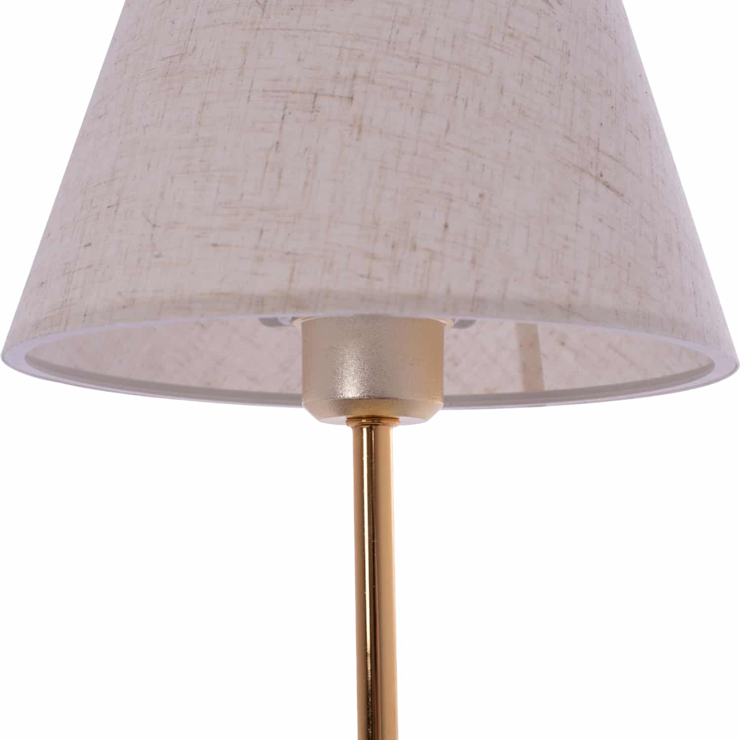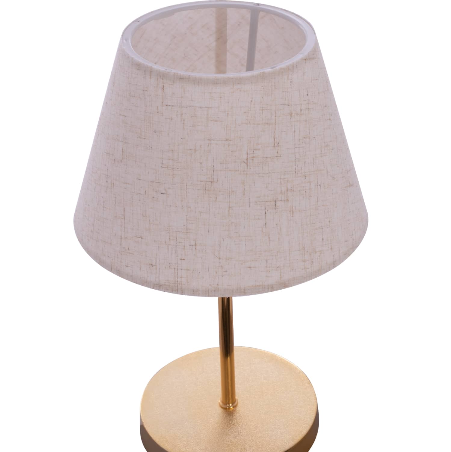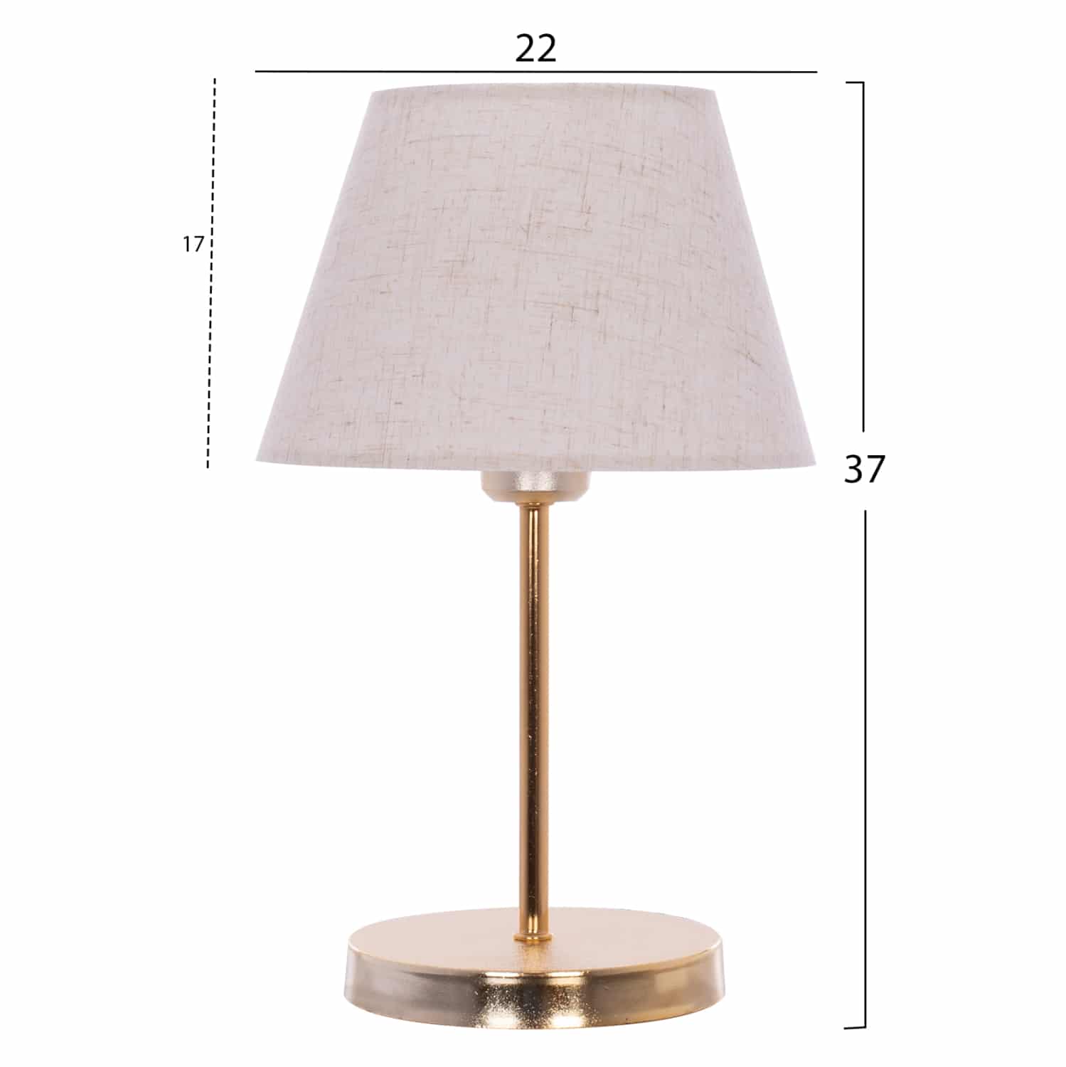 Μοντέρνο επιτραπέζιο φωτιστικό με κυκλική βάση και κολώνα σε χρυσό ματ χρώμα, και εκρού υφασμάτινο τραπεζοειδές καπέλο. Πρόκειται για διακοσμητικό φωτιστικό, σε απλή και λιτή γραμμή.