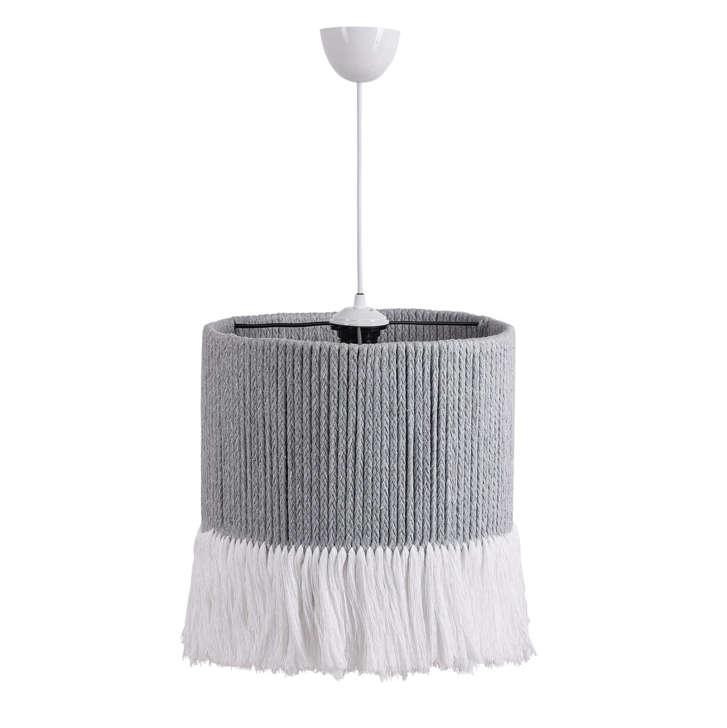 Hm7652.05- Kρεμαστό φωτιστικό—- Αν επιθυμείτε να διακοσμήσετε το χώρο σας με ένα φωτιστικό σε boho στυλ, αυτό είναι η πιο σωστή επιλογή. Είναι ένα μονόφωτο φωτιστικό με «καπέλο» σε σχήμα κυλίνδρου φτιαγμένο από ΓΚΡΙ λεπτό πλεκτό σκοινί, υψηλής ποιότητας και αντοχής στο χρόνο. Το ιδιαίτερο χαρακτηριστικό, όμως, αυτού του φωτιστικού είναι ότι το «καπέλο» καταλήγει σε κρόσια χρώματος ΛΕΥΚΟΥ, δίνοντας μια άλλη αίσθηση στον χώρο.