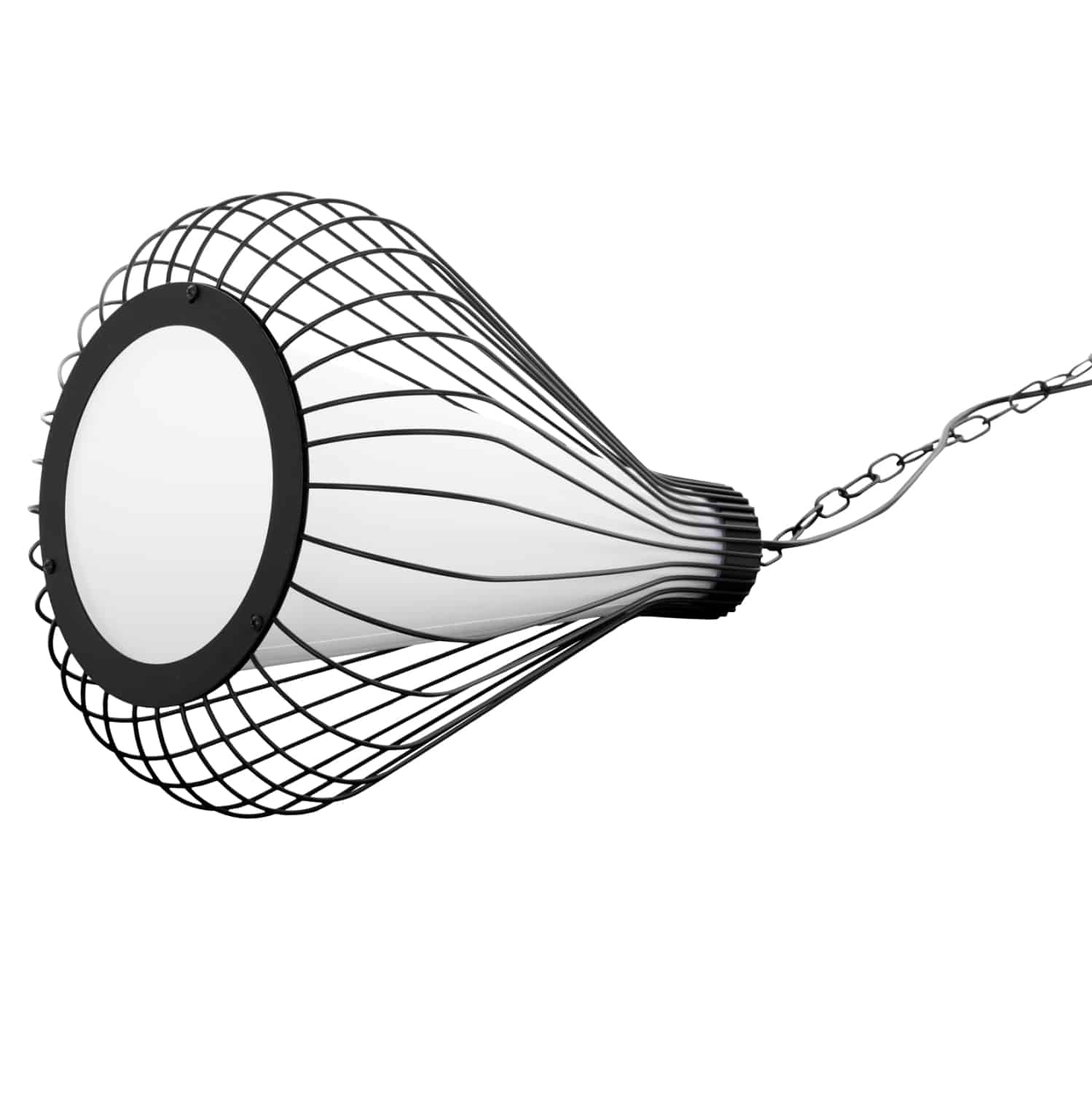 Ολόκληρο το φωτιστικό είναι από μέταλλο, όπως και η στρογγυλή βάση κρέμασης στην οροφή. Το κάλυμμα του λαμπτήρα είναι από συνθετικό ύφασμα.