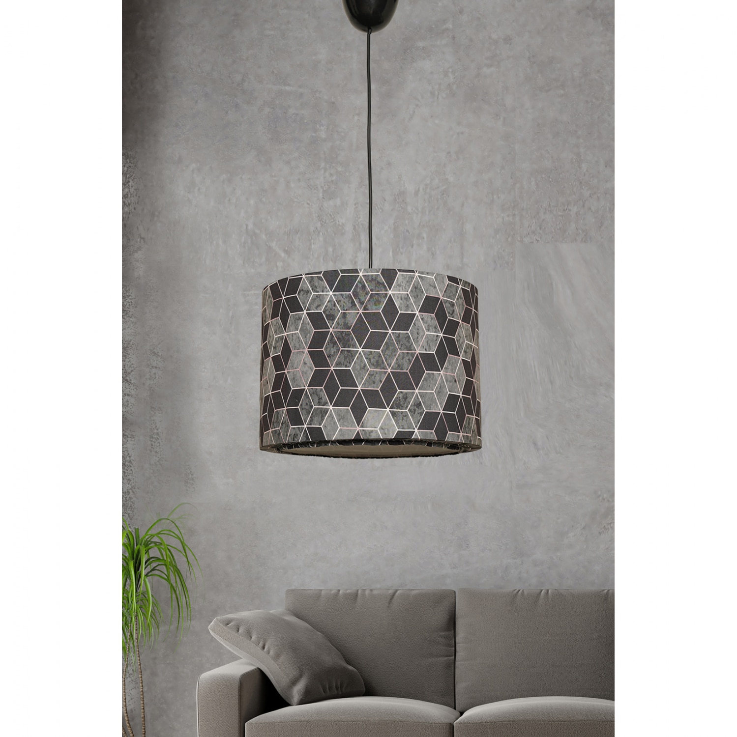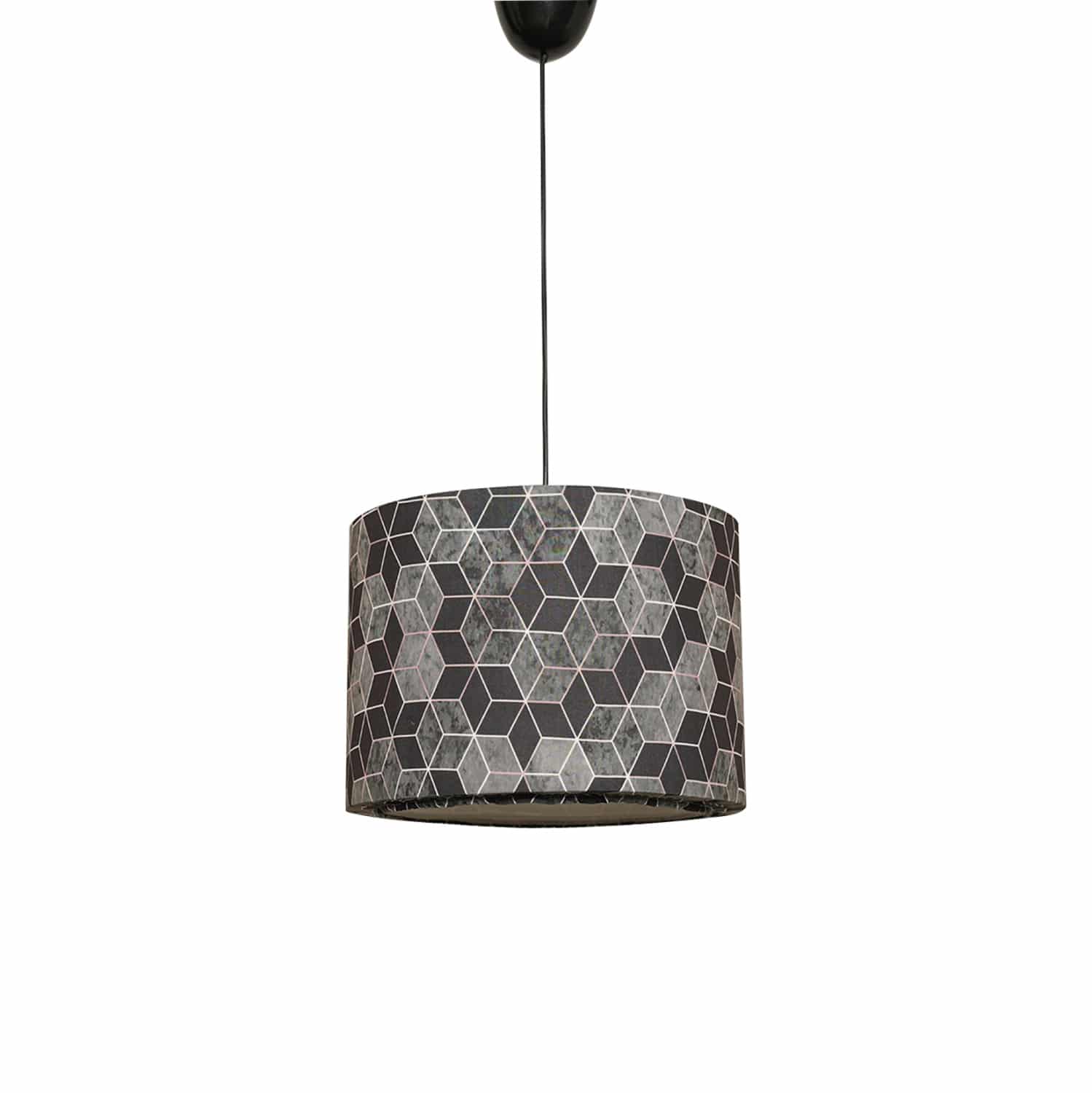 Μοντέρνο κρεμαστό φωτιστικό οροφής, κατασκευασμένο από μεταλλικό σκελετό και επενδυμένο από ύφασμα με γεωμετρικό μοτίβο σε μαύρη και γκρι απόχρωση.