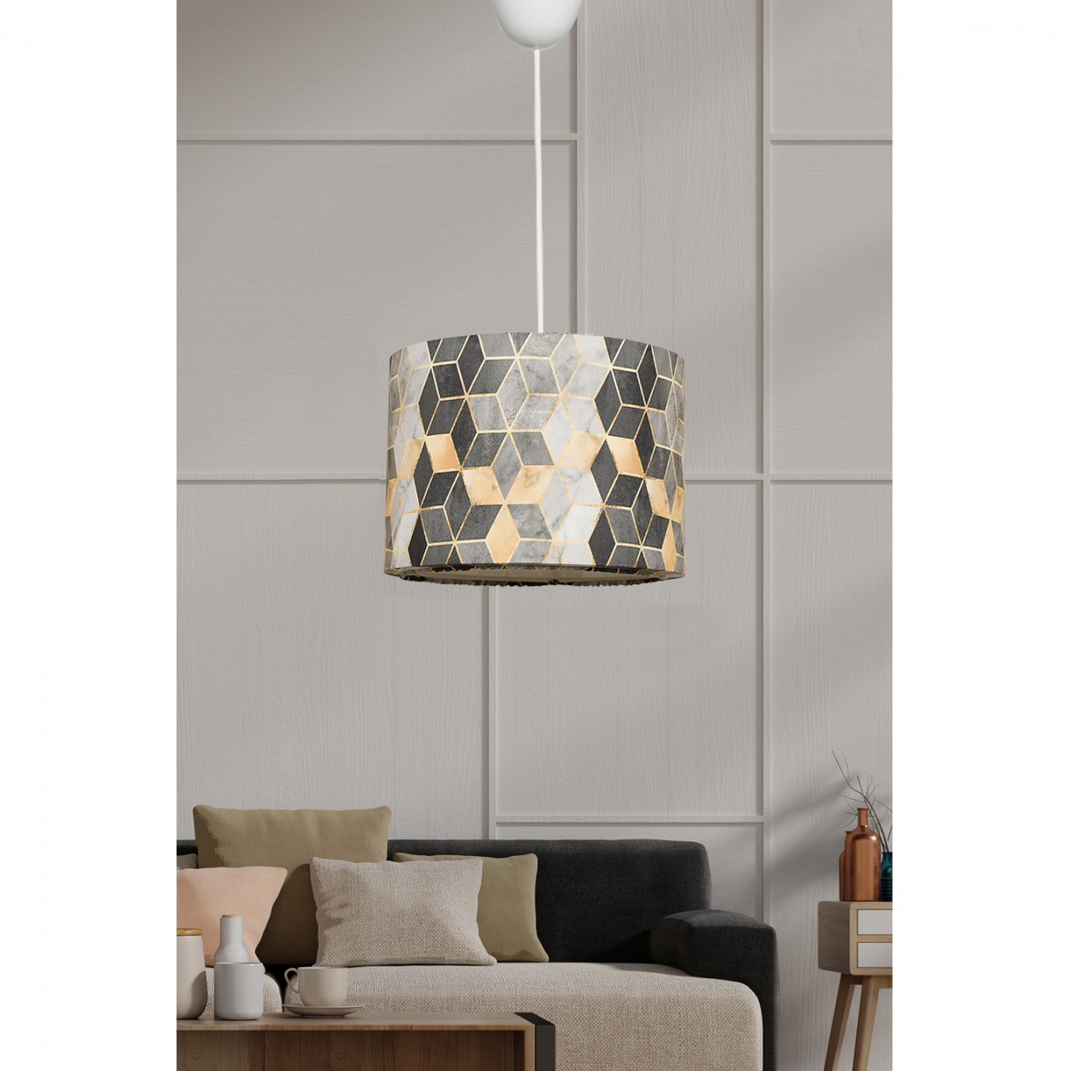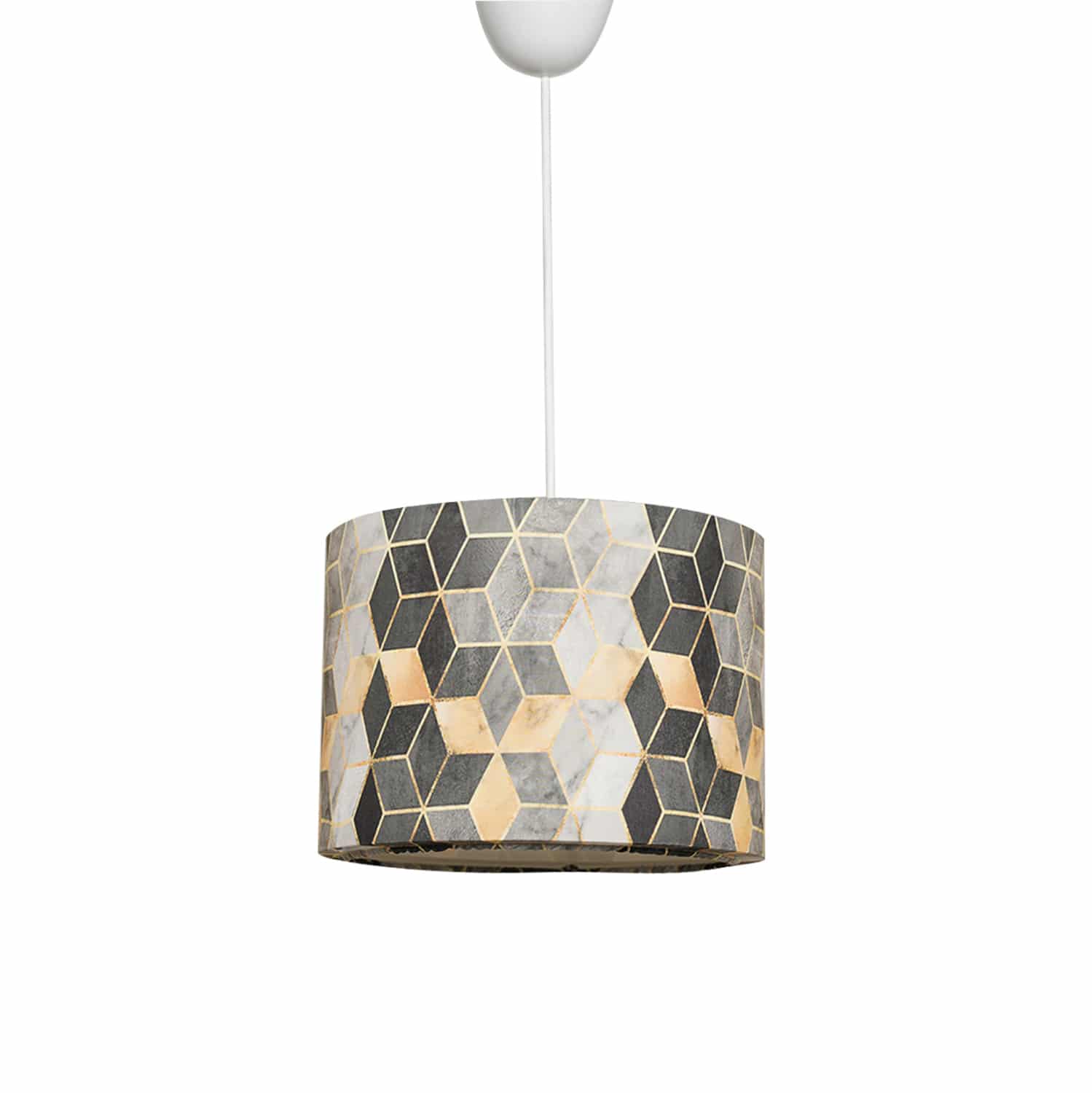Μοντέρνο κρεμαστό φωτιστικό οροφής, κατασκευασμένο από μεταλλικό σκελετό και επενδυμένο από ύφασμα με γεωμετρικό μοτίβο γκρι και κίτρινη απόχρωση.