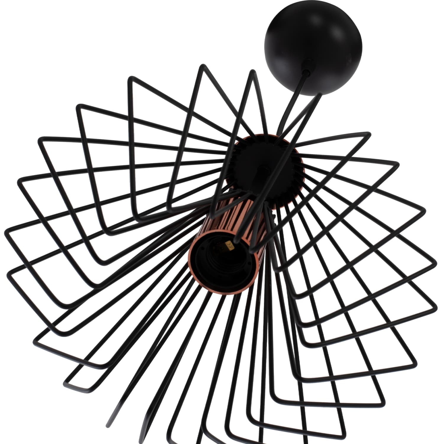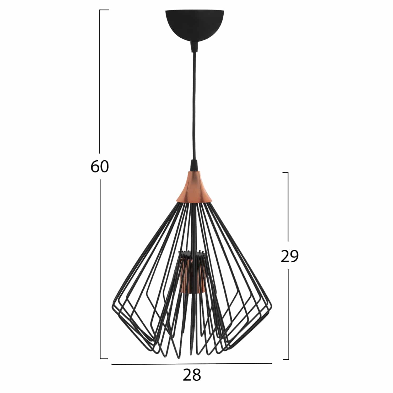 HM7683.01-Φωτιστικό οροφής —–Αυτό το φωτιστικό οροφής είναι ένα μοντέρνο φωτιστικό με μεταλλικές βέργες σε σχήμα «διαμάντι». Το χρώμα του είναι μαύρο ενώ στην κορυφή του σχήματος οι βέργες ενώνονται κάτω από ένα χάλκινο κάλυμμα. Το ντουί που βιδώνεται η λάμπα είναι επίσης χάλκινο, ολοκληρώνοντας την όμορφη διχρωμία του φωτιστικού. Το σίγουρο είναι ότι αυτό το φωτιστικό θα δώσει ένα εντελώς διαφορετικό look στον χώρο σας και θα τραβήξει τα βλέμματα!