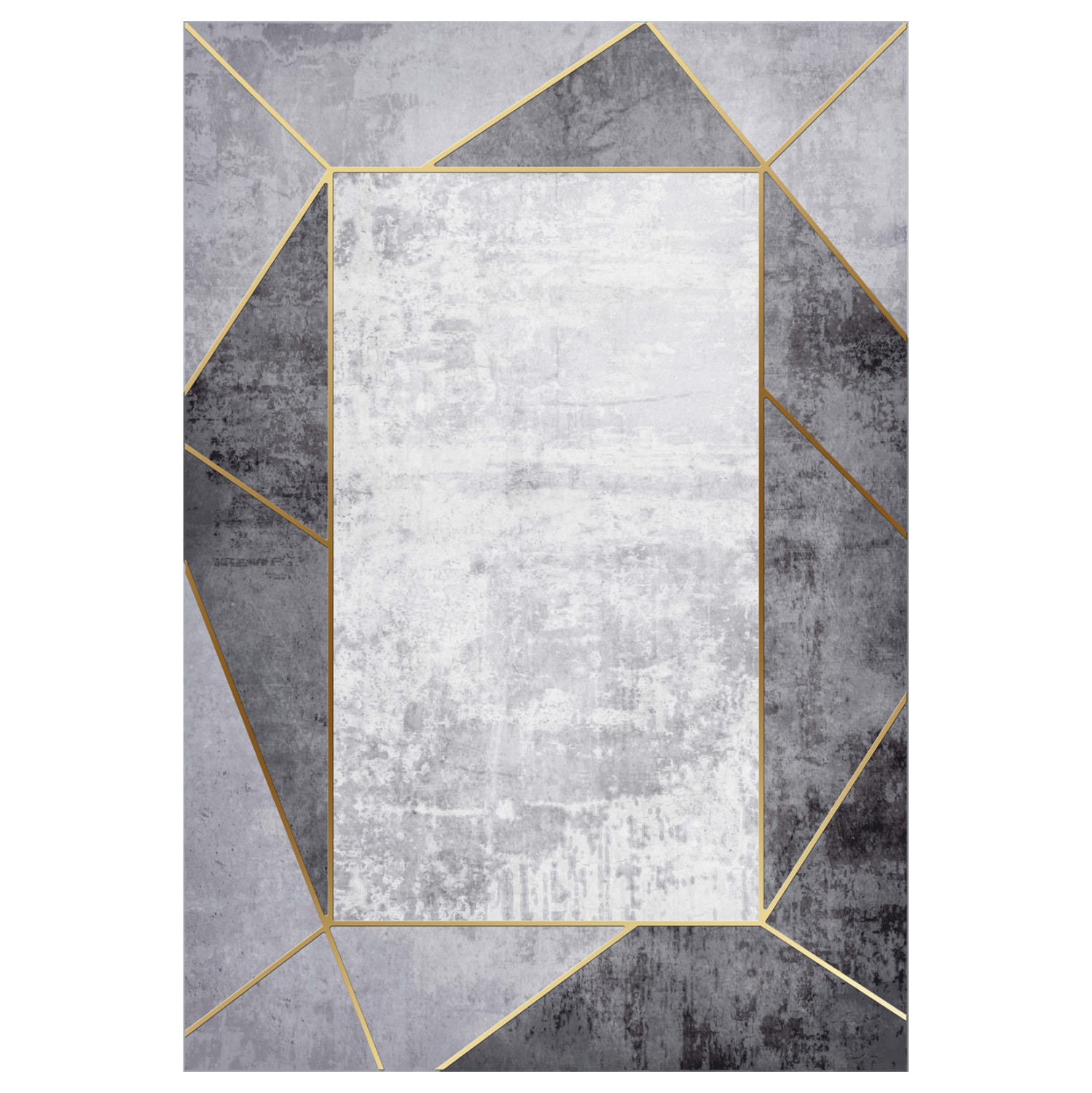 Αυτό το μοντέρνο χαλί έχει κυρίαρχα χρώματα το άσπρο, το γκρι σε δύο αποχρώσεις, και το χρυσό στις γραμμές. Το έντονο χαρακτηριστικό του είναι το λευκό ορθογώνιο στο κέντρο του χαλιού που μοιάζει με καθρέφτη με χρυσό πλαίσιο. Ένα μοντέρνο χαλί που θα τραβήξει τα βλέμματα και θα αναβαθμίσει αισθητικά το σαλόνι σας.