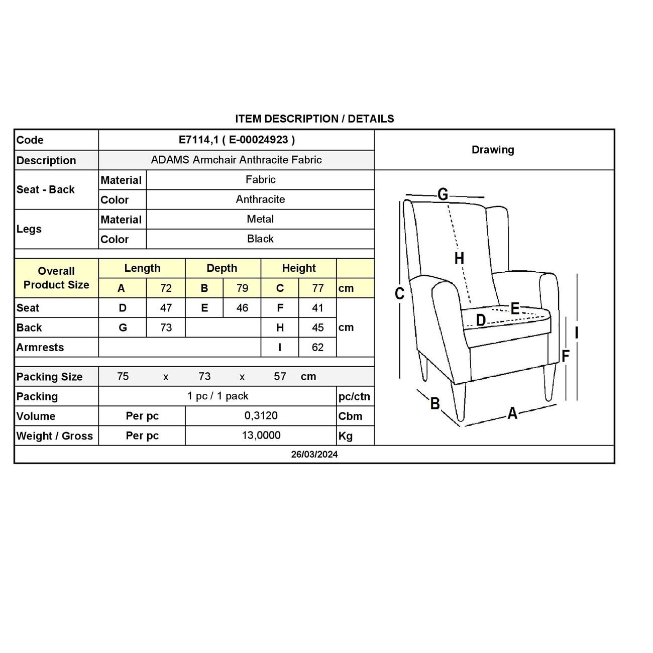 Ε7114,1 ADAMS Πολυθρόνα Ύφασμα Ανθρακί
