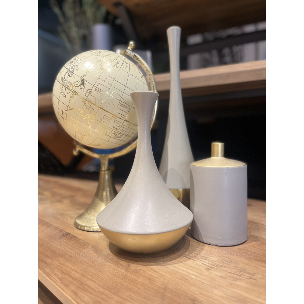 Το κεραμικό βάζο AIMA Tall σε αποχρώσεις γκρι ματ και χρυσού αποπνέει κομψότητα και πολυτέλεια με μίνιμαλ χαρακτήρα. Οι λείες καμπύλες του σε συνδυασμό με το μεταλλικό φινίρισμα στη βάση το καθιστούν ένα statement αντικείμενο για κάθε χώρο. Με ύψος 41 cm, είναι ιδανικό για να τραβήξει τα βλέμματα σε ράφια, μπουφέδες ή βοηθητικά τραπεζάκια. Αποκλειστικά διακοσμητικό – δεν προορίζεται για χρήση με νερό.