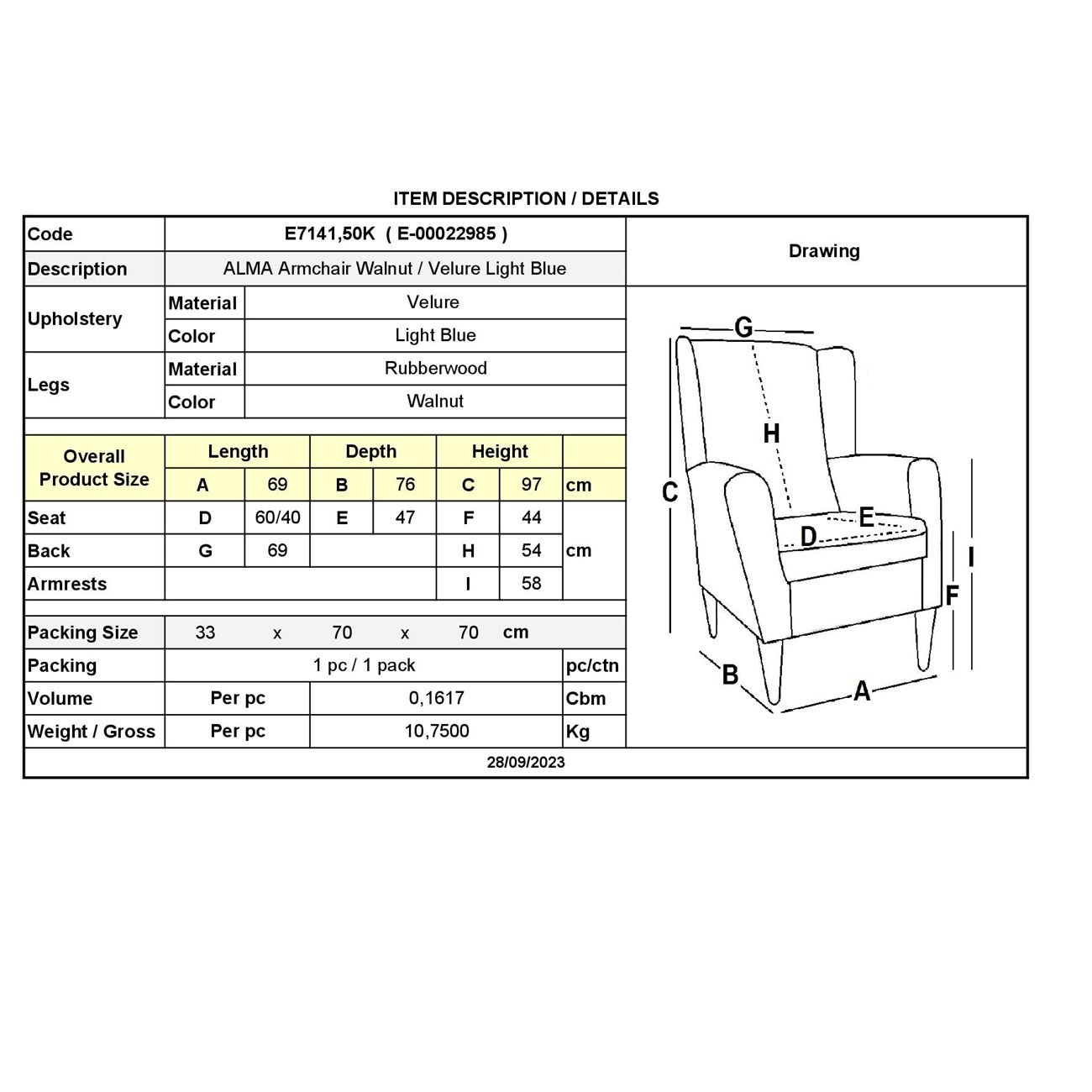 ALMA Πολυθρόνα – Μπερζέρα Σαλονιού – Καθιστικού Καρυδί Ύφασμα Ανοιχτό Μπλε Velure,K/D (Ε-00022985)