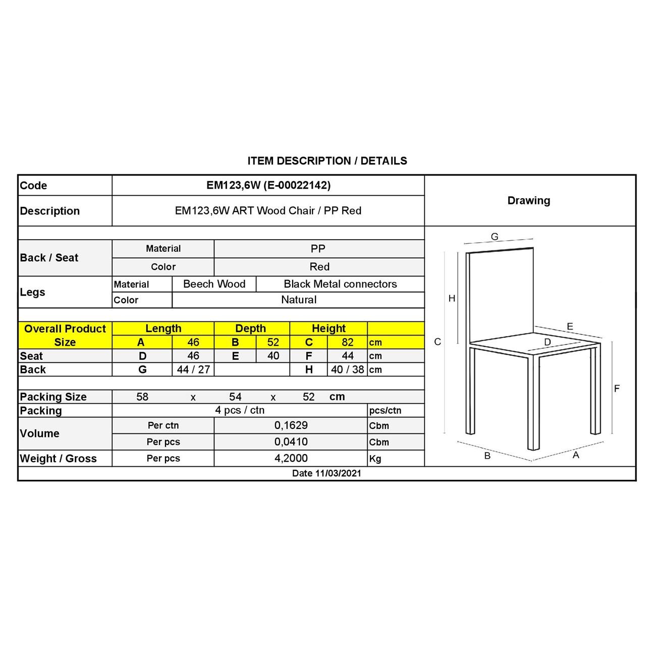 ΕΜ123,6W ART Wood Καρέκλα PP Κόκκινο