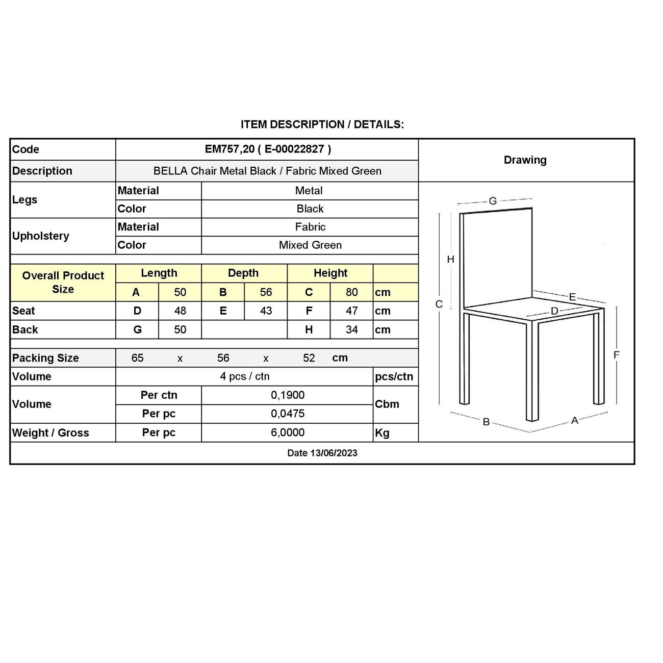 BELLA Καρέκλα Τραπεζαρίας, Μέταλλο Βαφή Μαύρο, Ύφασμα Απόχρωση Mixed Green 50x56x80cm