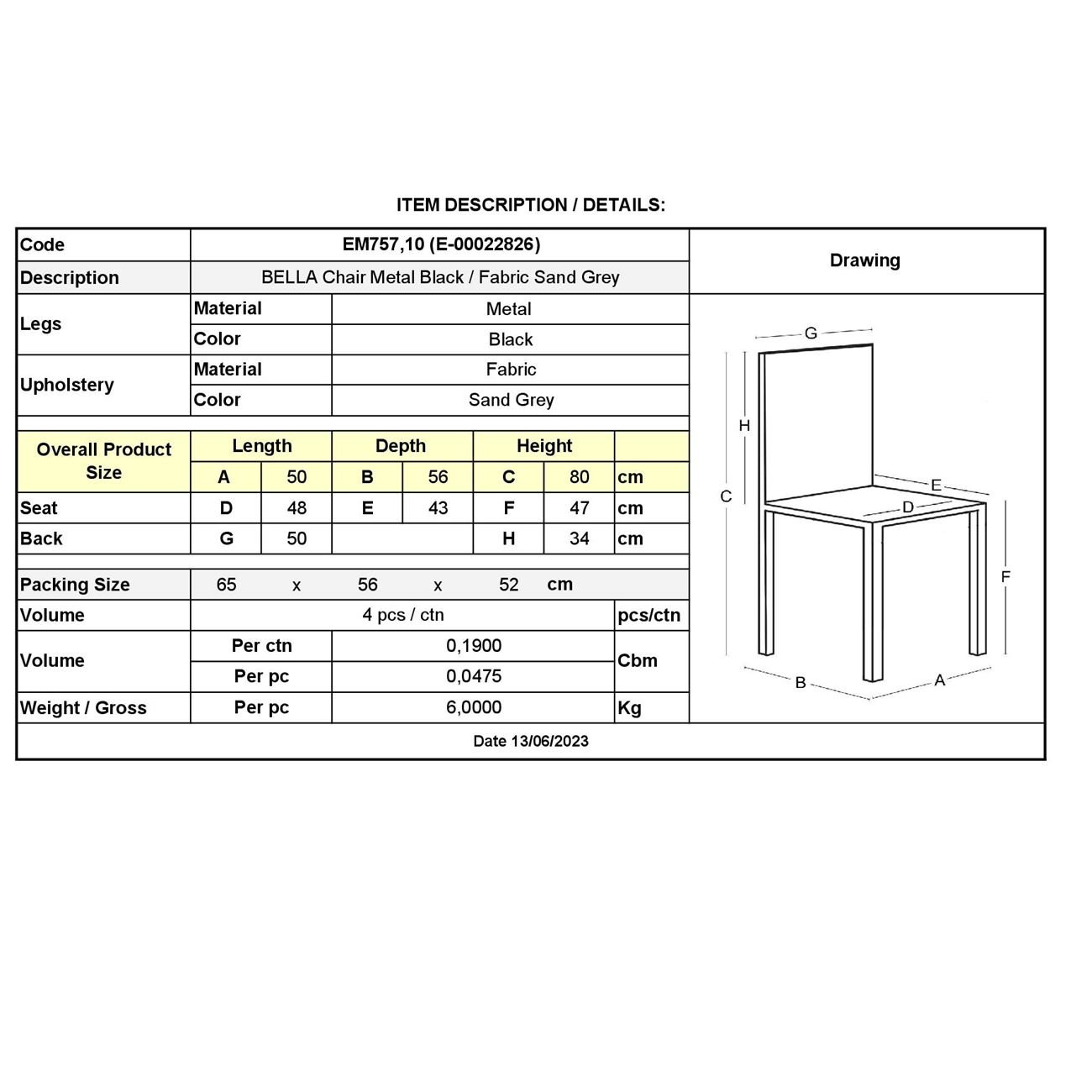 ΕΜ757,10 BELLA Καρέκλα Μέταλλο Μαύρο/Ύφασμα Sand Grey