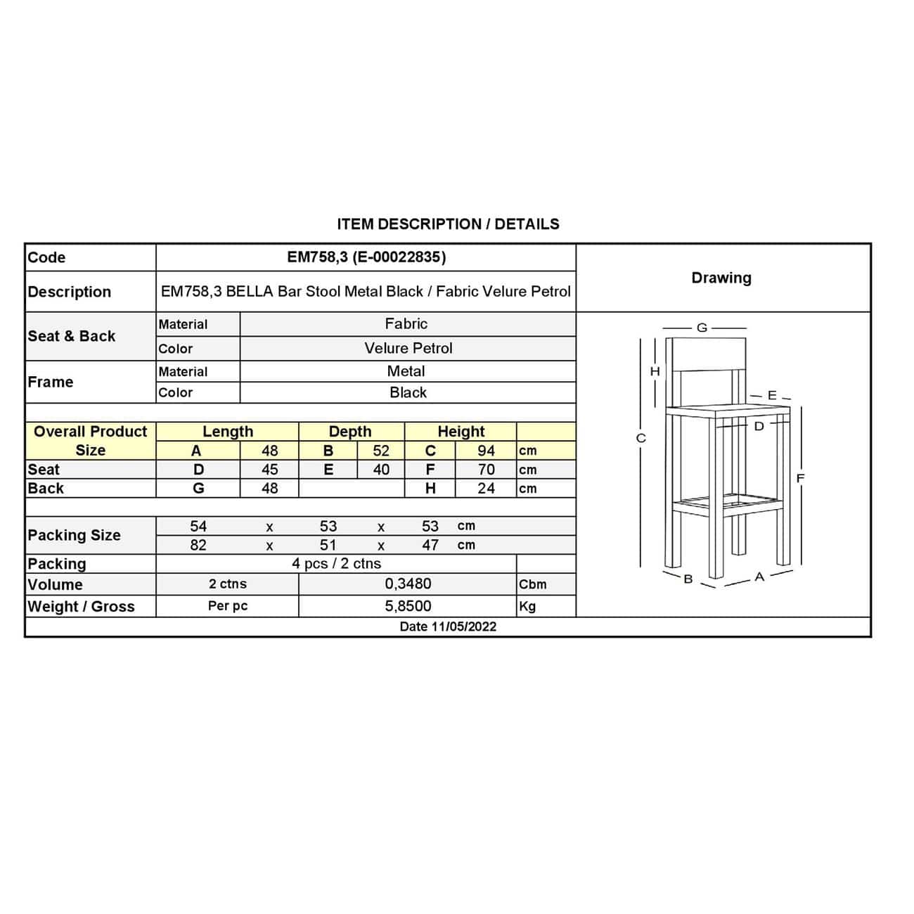 ΕΜ758,3 BELLA Σκαμπό BAR Μεταλ.Μαύρο/Ύφασμα Velure Petrol