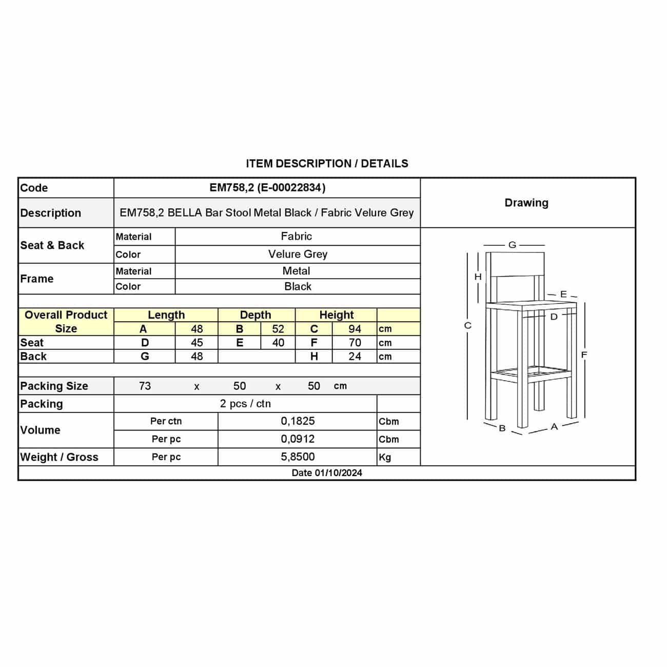 ΕΜ758,2 BELLA Σκαμπό BAR Μεταλ.Μαύρο/Ύφασμα Velure Γκρι