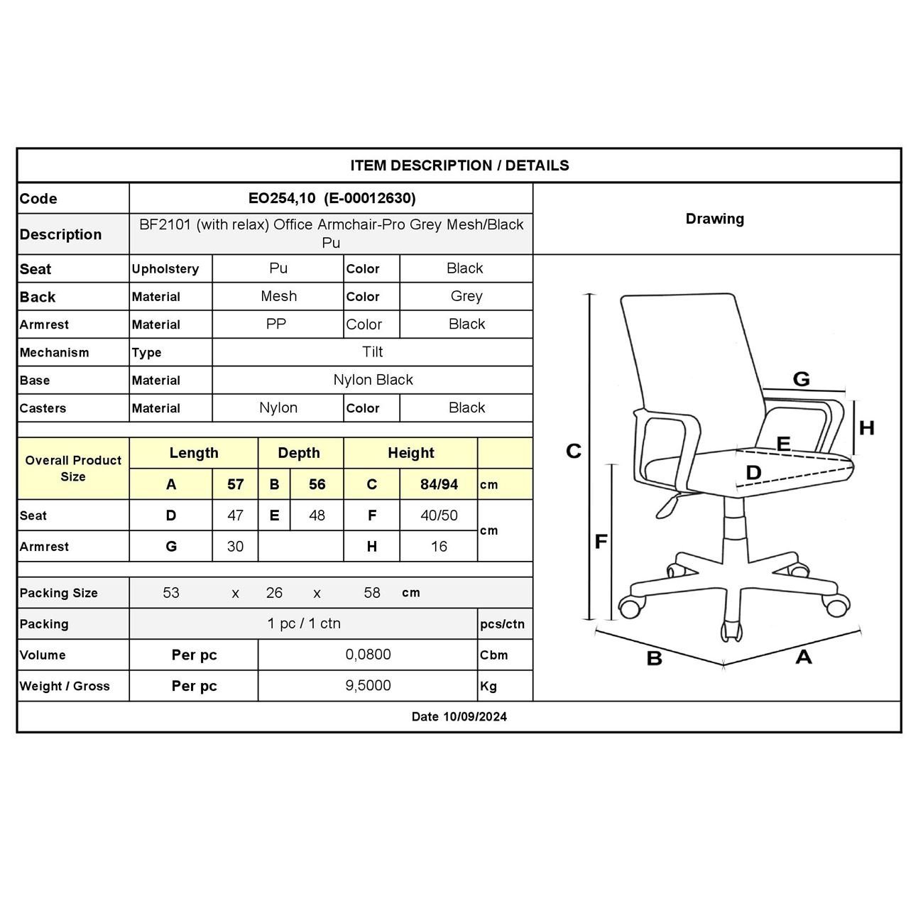 BF2101 Πολυθρόνα-Pro Γραφείου με Ανάκλιση, Γκρι Mesh – Μαύρο PU 57x56x84/94cm