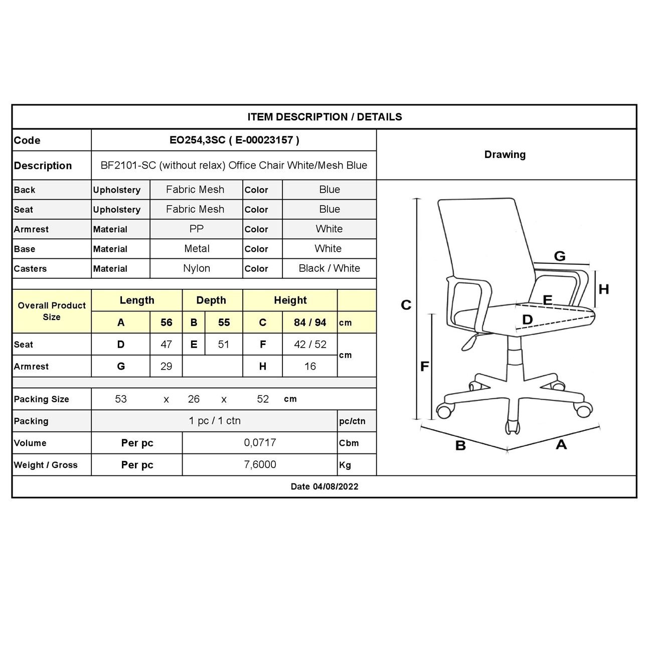 BF2101-SC Πολυθρόνα Γραφείου χωρίς Ανάκλιση Άσπρο – Mesh Μπλε 56x55x84/94cm