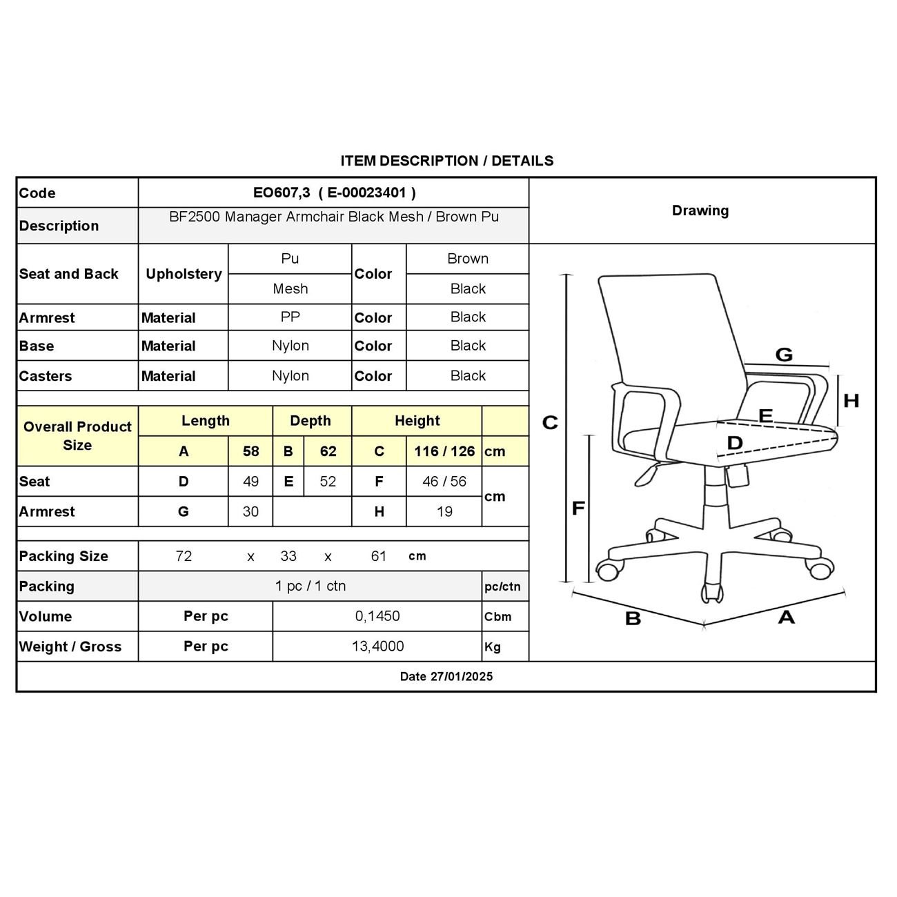 ΕΟ607,3 BF2500 Πολυθρόνα Διευθυντή Mesh Μαύρο – Pu Καφέ