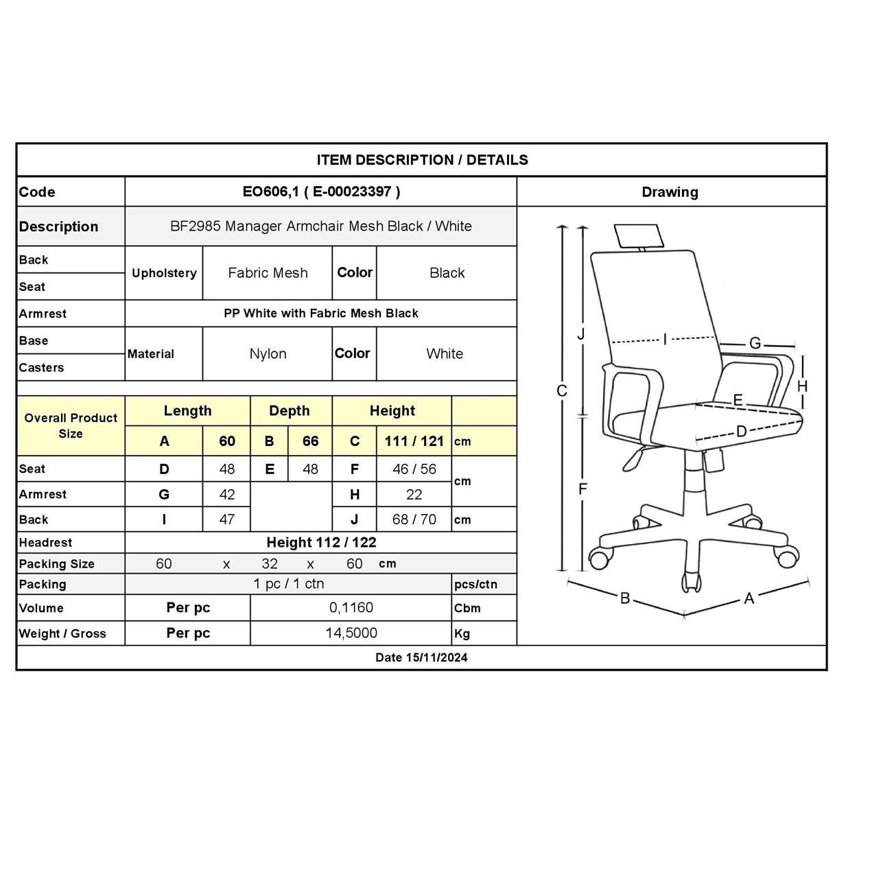 ΕΟ606,1 BF2985 Πολυθρόνα Διευθυντή Άσπρο/Mesh Μαύρο