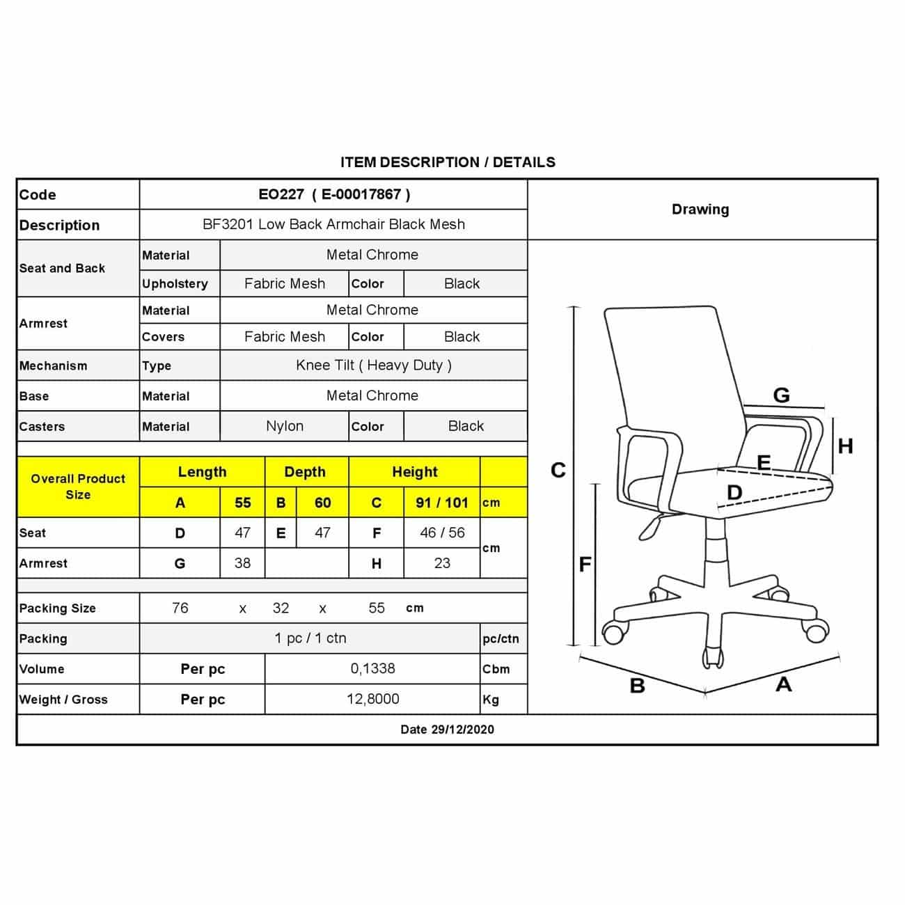 BF3201 Πολυθρόνα Γραφείου Χαμηλή Πλάτη – Mesh Μαύρο 55x60x91/101cm