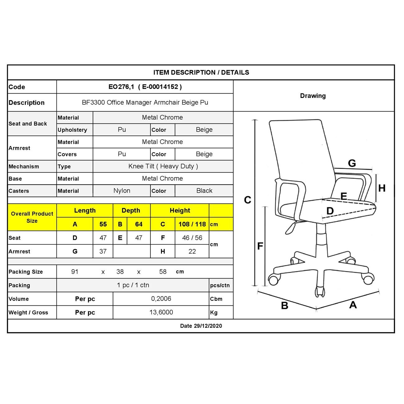 BF3300 Πολυθρόνα Γραφείου Διευθυντή, Μέταλλο Βάση Χρώμιο PU Μπεζ 55x64x108/118cm