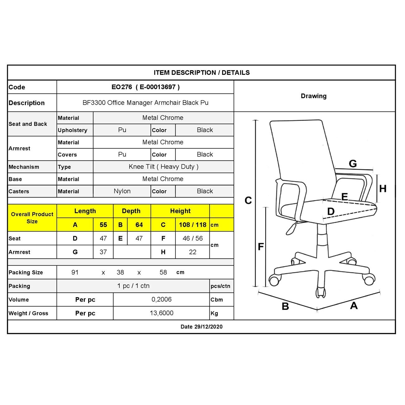 BF3300 Πολυθρόνα Γραφείου Διευθυντή, Μέταλλο Βάση Χρώμιο PU Μαύρο 55x64x108/118cm