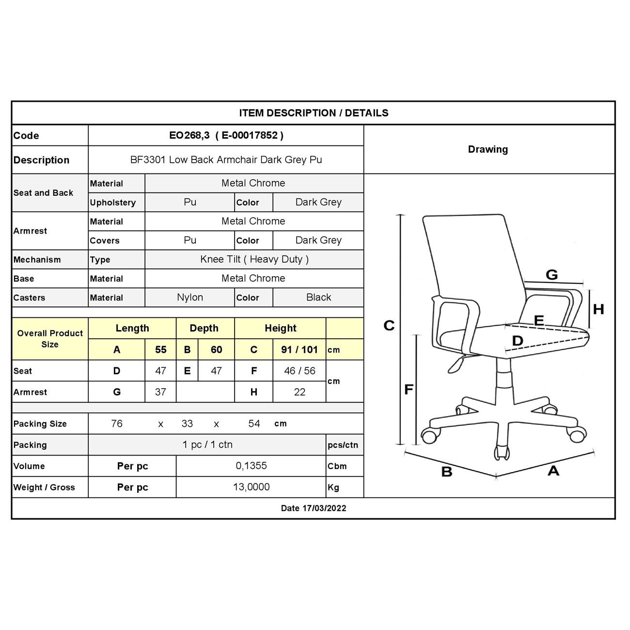 BF3301 Πολυθρόνα Γραφείου Μέταλλο Βάση Χρώμιο, PU Γκρι 55x60x91/101cm