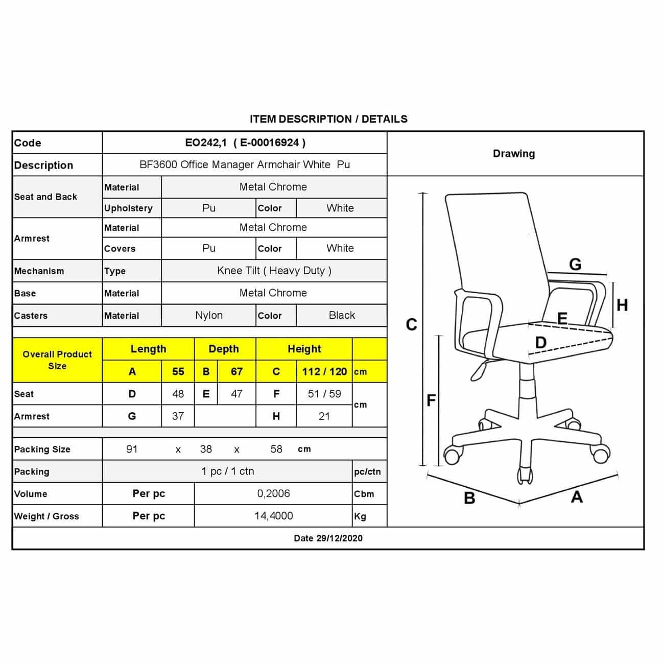 BF3600 Πολυθρόνα Διευθυντή Μέταλλο Βάση Χρώμιο, PU Άσπρο 55x67x112/120cm