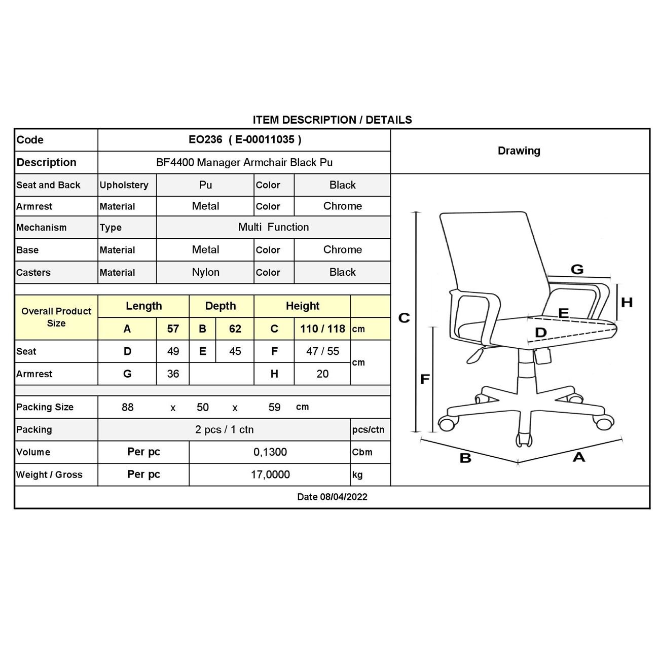 BF4400 Πολυθρόνα Διευθυντή Μέταλλο Χρώμιο – PU Μαύρο 57x62x110/118cm