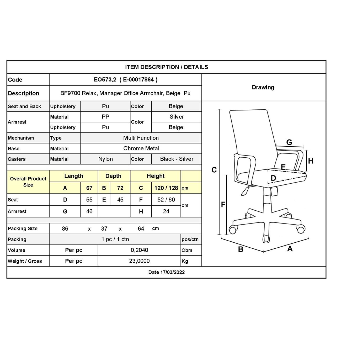 BF9700 Relax Πολυθρόνα Γραφείου Διευθυντή, με Υποπόδιο, Βάση Χρώμιο,PU Μπεζ 67x72x120/128cm