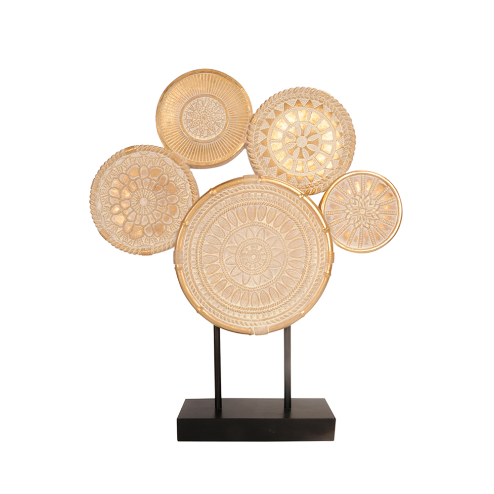 Το διακοσμητικό BLARE Totem, διαστάσεων 34x8x41cm, είναι κατασκευασμένο από πολυρεζίνη σε χρυσό χρώμα με μαύρη βάση και παρουσιάζει μια καλλιτεχνική σύνθεση από πέντε κυκλικές φόρμες με ανάγλυφα γεωμετρικά μοτίβα. Ένα κομψό και ταυτόχρονα εντυπωσιακό αντικείμενο που αποπνέει boho και ethnic χαρακτήρα, ιδανικό για διακόσμηση σε ράφια, κονσόλες ή επαγγελματικούς χώρους.