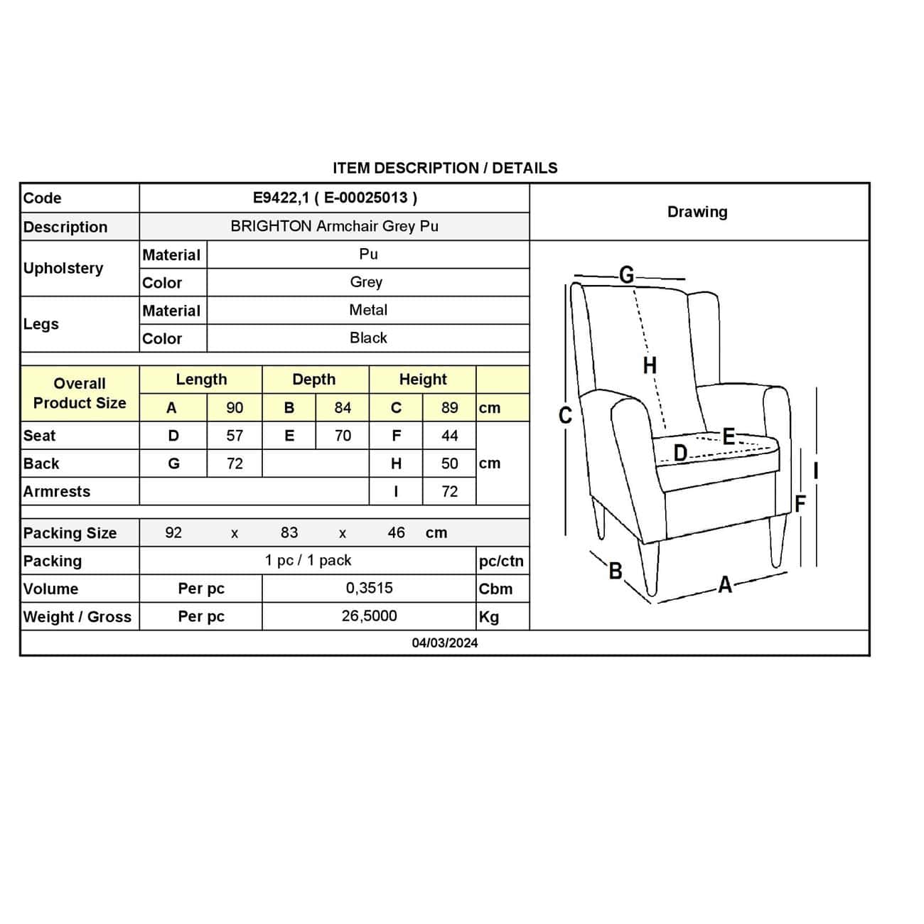 BRIGHTON Πολυθρόνα Σαλονιού – Καθιστικού, Pu Γκρι 90x84x89cm