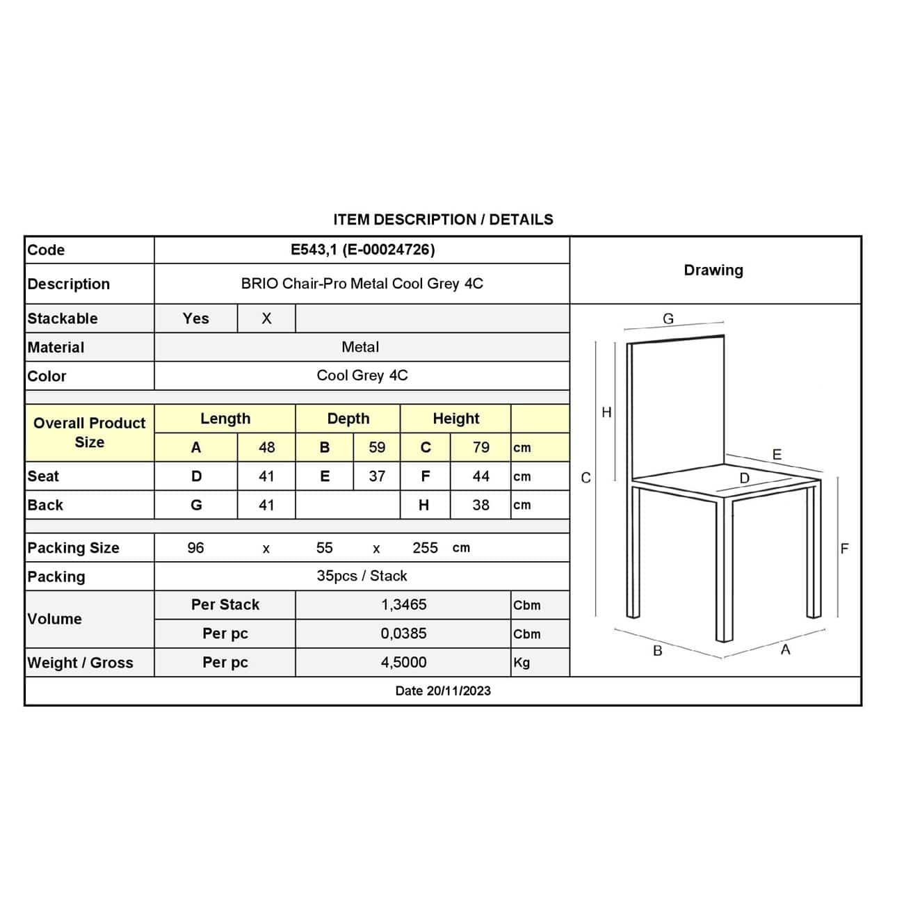 BRIO Καρέκλα-Pro Στοιβαζόμενη Μέταλλο Βαφή Cool Grey 4C (Ε-00024726)