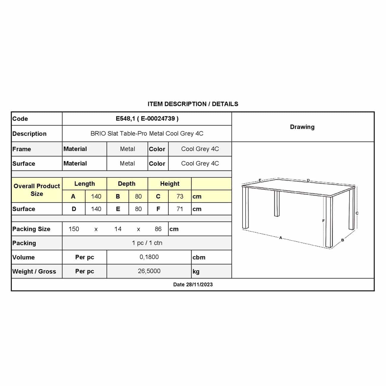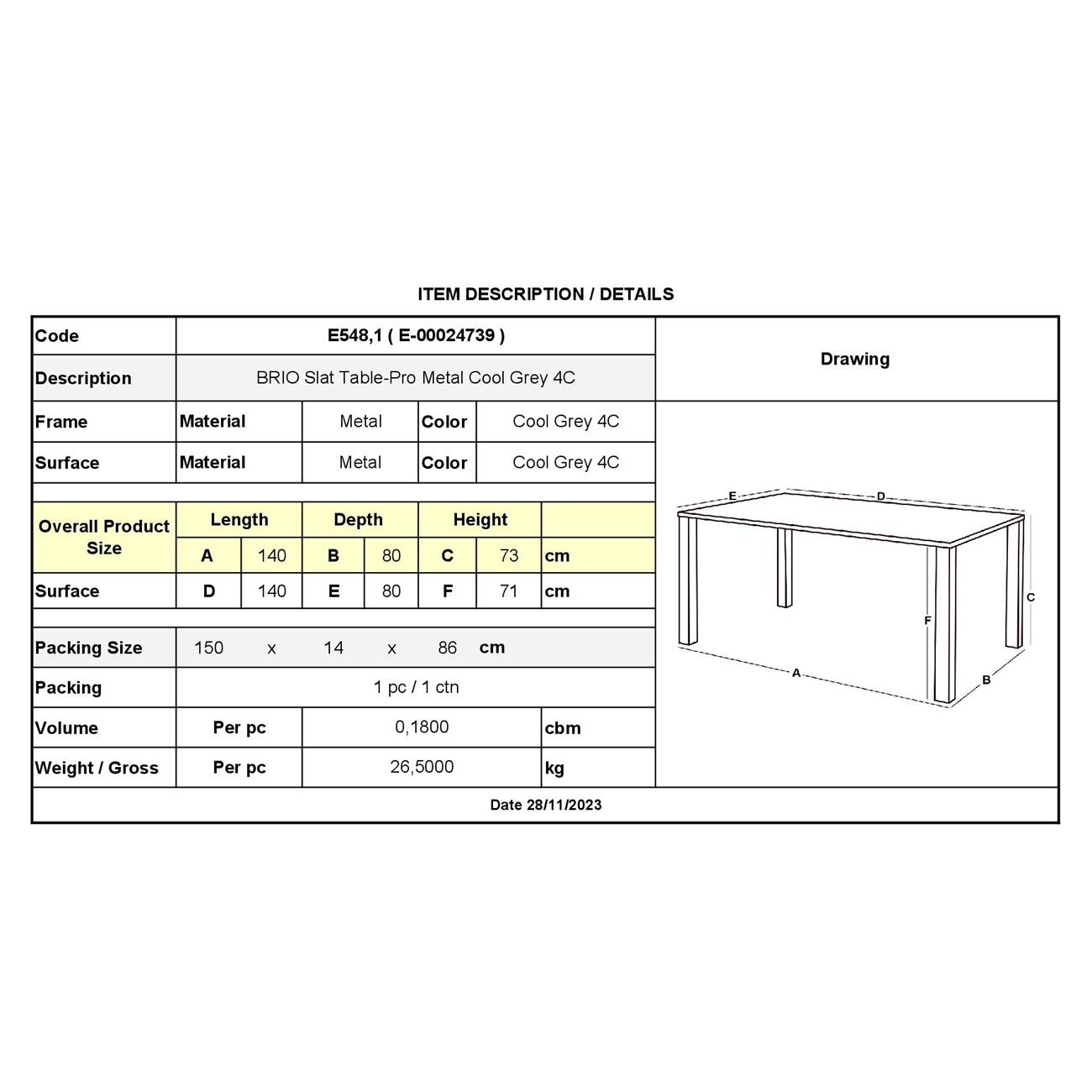 BRIO Flat Τραπέζι-Pro Κήπου – Βεράντας, Μέταλλο Βαφή Cool Grey 4C 140x80x73cm