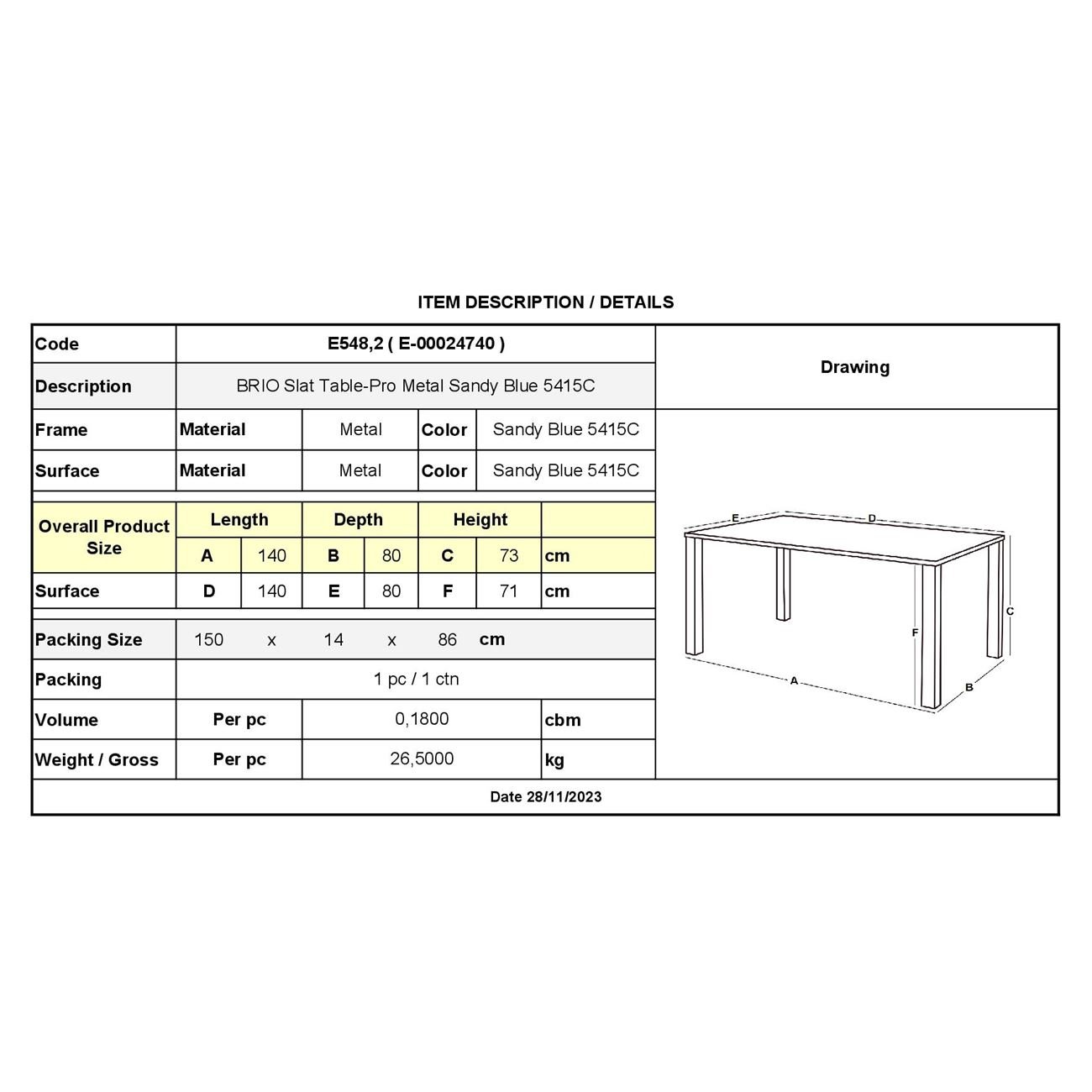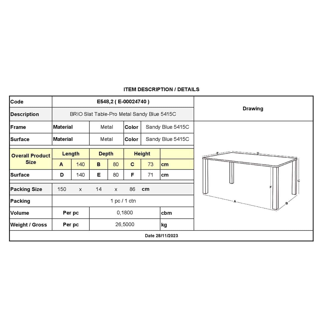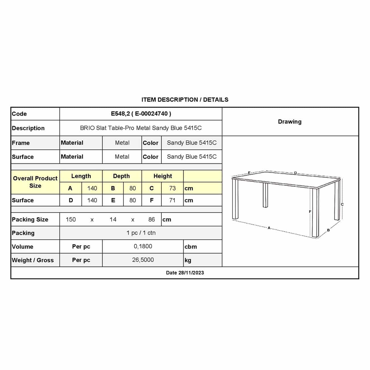 BRIO Flat Τραπέζι-Pro Κήπου – Βεράντας, Μέταλλο Βαφή Sandy Blue 5415C (Ε-00024740)