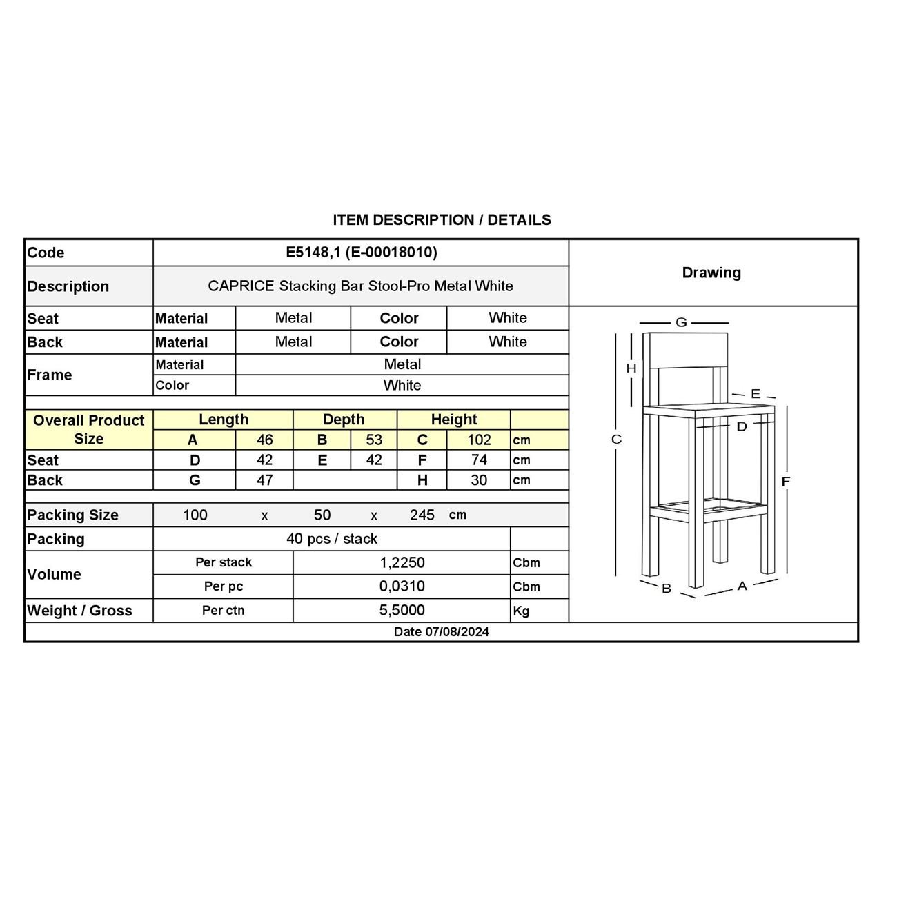CAPRICE Σκαμπό BAR-Pro με Πλάτη Στοιβαζόμενο, Μέταλλο Βαφή Άσπρο (Ε-00018010)