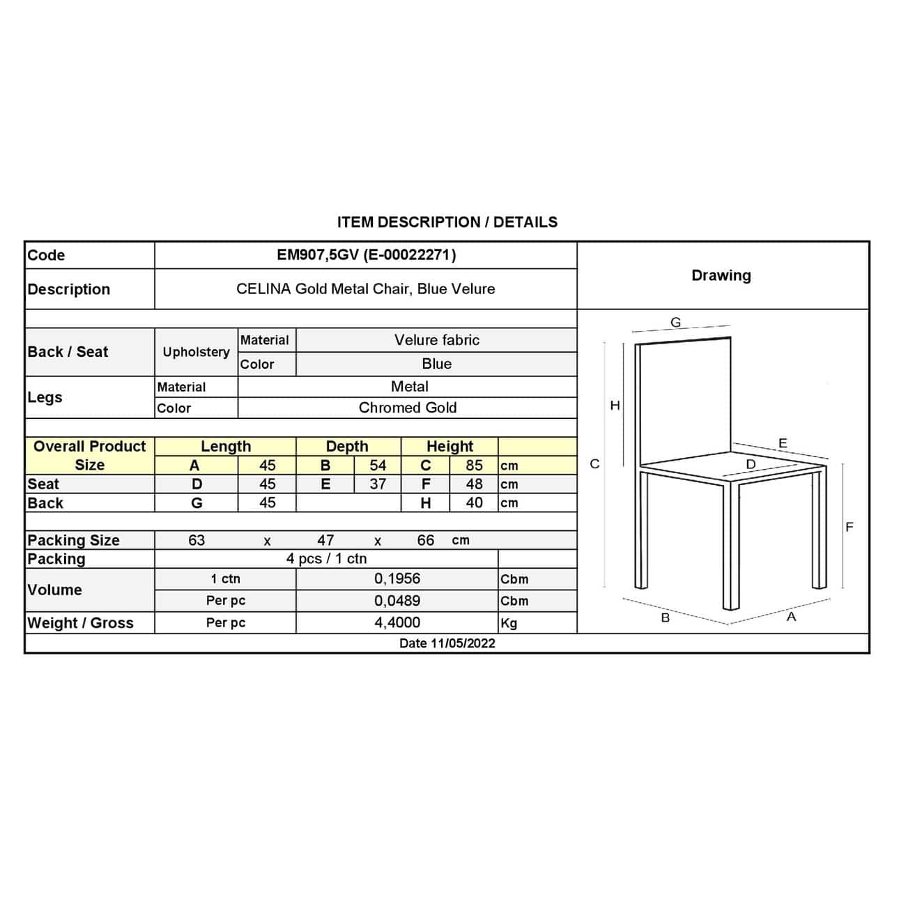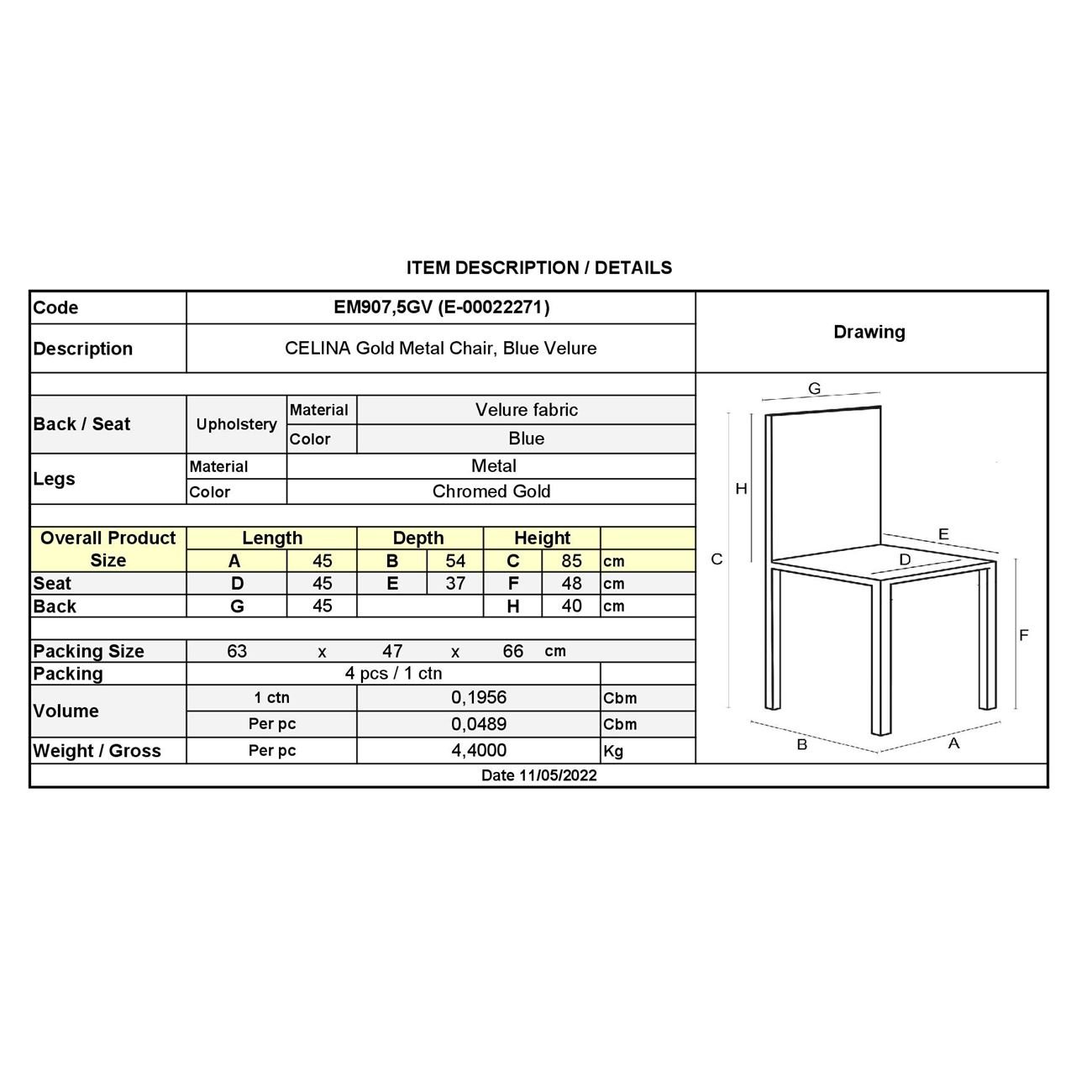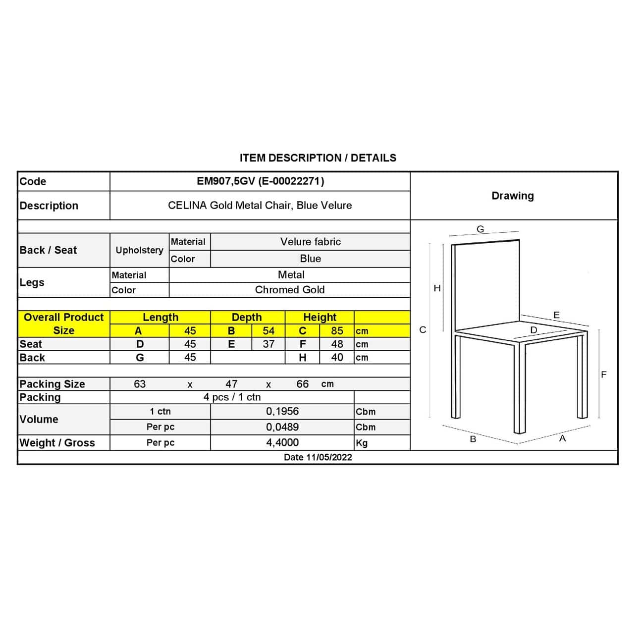 CELINA Καρέκλα Χρώμιο Χρυσό, Velure Μπλε (Ε-00022271)