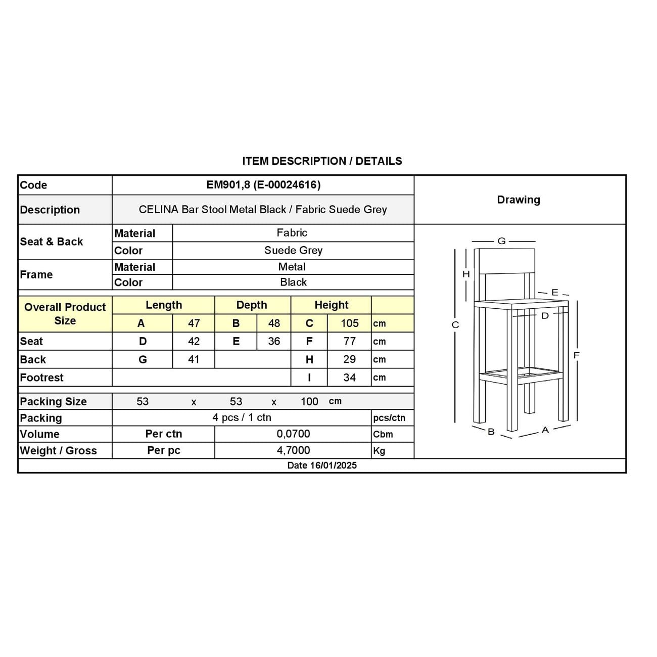 ΕΜ901,8 CELINA Σκαμπό Bar Μεταλ.Μαύρο, Ύφ.Suede Ανθρακί