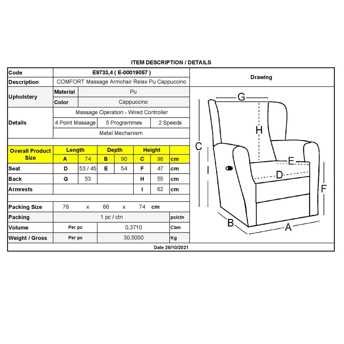 COMFORT Massage Πολυθρόνα Relax, Σαλονιού – Καθιστικού, PU Cappuccino 74x90x98cm