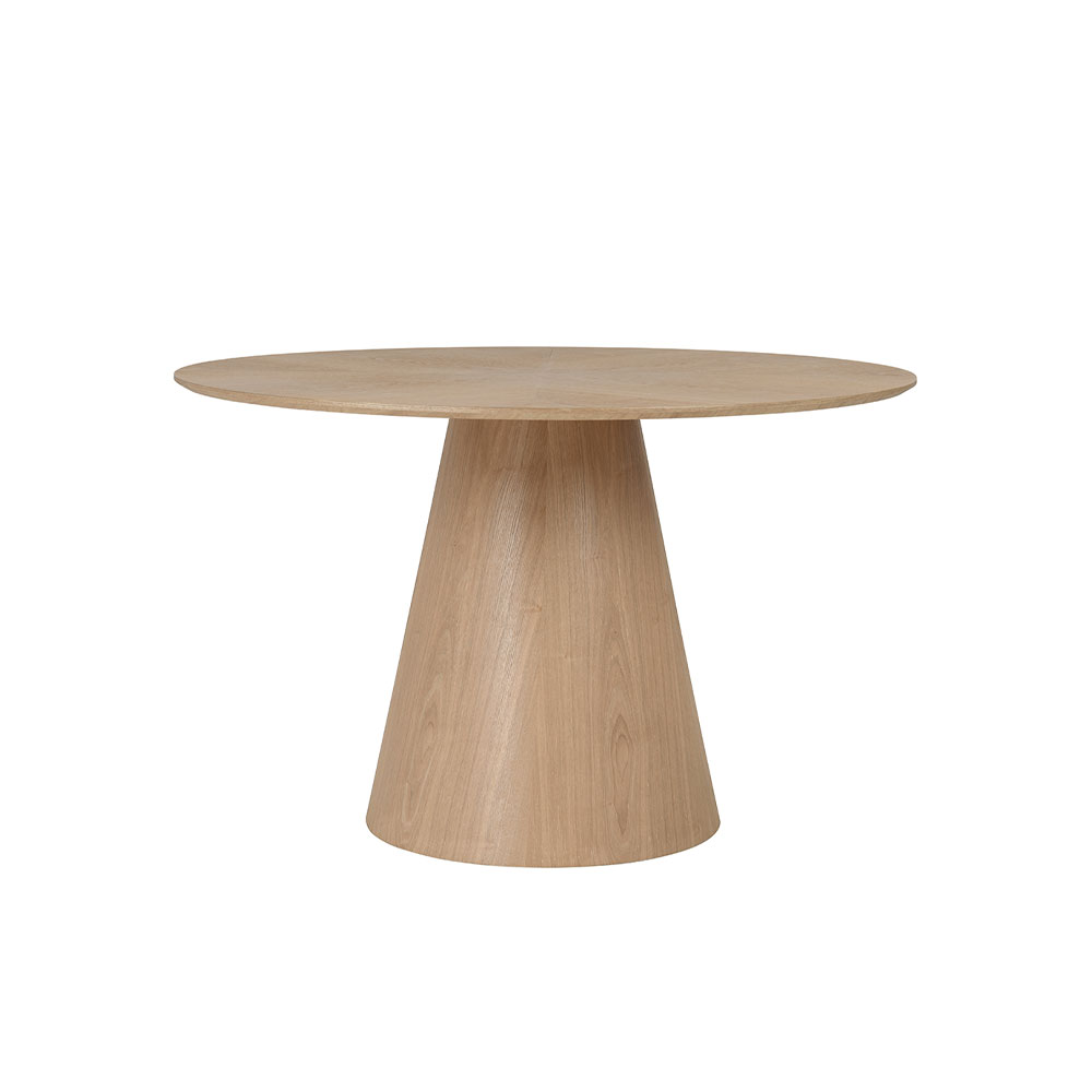 Το στρογγυλό τραπέζι CONO σε φυσική απόχρωση ξεχωρίζει για τον γλυπτικό σχεδιασμό του και την ισορροπημένη γεωμετρία. Η βάση σε σχήμα κώνου δίνει χαρακτήρα και σταθερότητα, ενώ η επιφάνεια από veneer δρυς σε φυσικό χρώμα αποπνέει φωτεινότητα και φρεσκάδα. Με διάμετρο 120 cm και ύψος 75 cm, αποτελεί ιδανική επιλογή για compact τραπεζαρίες ή cozy χώρους. Ένα design τραπέζι που εντυπωσιάζει με την απλότητά του.