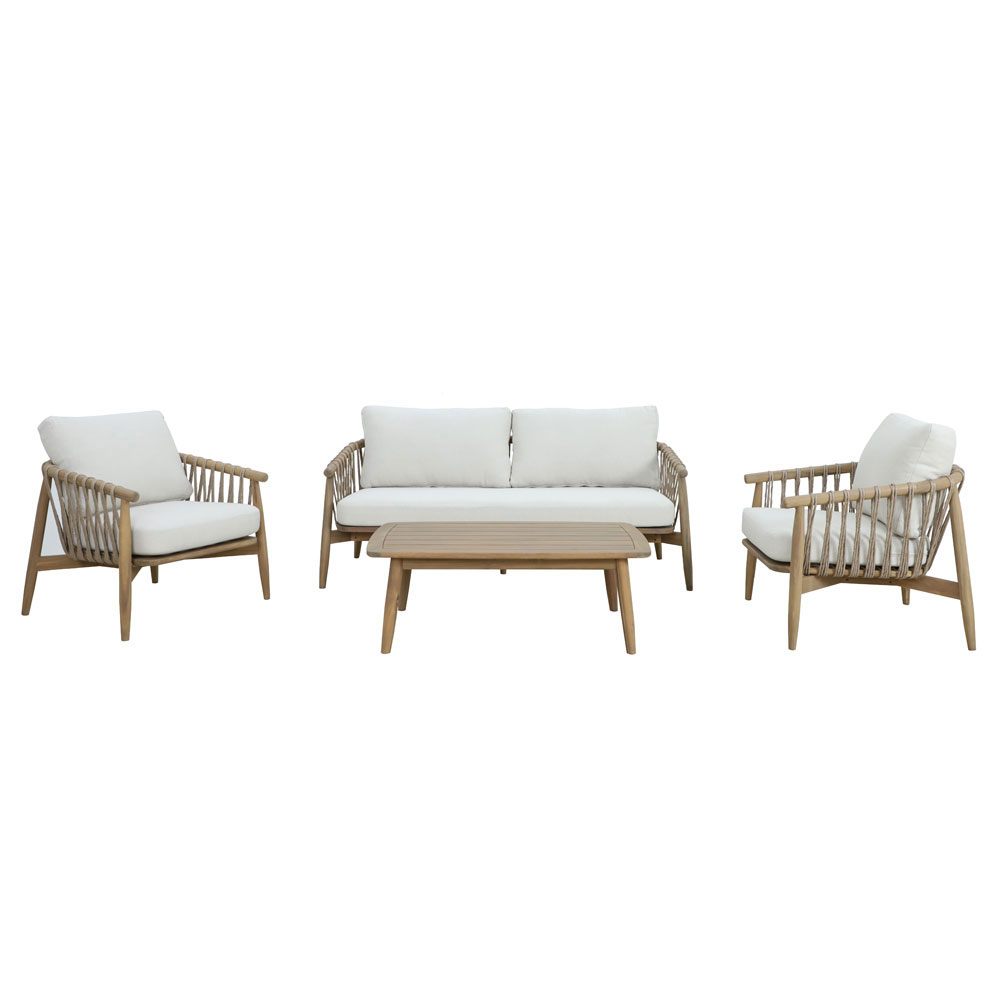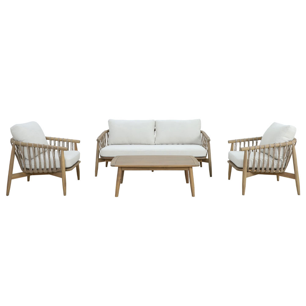 Το σετ σαλονιού Corda συνδυάζει την αυθεντικότητα του φυσικού ξύλου με τον αέρινο σχεδιασμό, δημιουργώντας έναν κομψό και φιλόξενο χώρο χαλάρωσης. Κατασκευασμένο από ξύλο ακακίας σε φυσική απόχρωση, αποπνέει ζεστασιά και διαχρονικότητα. Το σετ αποτελείται από καναπέ, δύο πολυθρόνες και τραπεζάκι σαλονιού, προσφέροντας άνεση και λειτουργικότητα. Τα μαξιλάρια σε λινό ύφασμα λευκού χρώματος εξασφαλίζουν πολυτελή αίσθηση και ξεκούραστο κάθισμα. Τα διακοσμητικά σχοινιά στην πλάτη και στα πλαϊνά ολοκληρώνουν τον σχεδιασμό με μια ιδιαίτερη, μοντέρνα πινελιά. Ιδανικό για εσωτερικούς και εξωτερικούς χώρους, το σετ Corda προσφέρει απαράμιλλη αισθητική και ποιότητα.