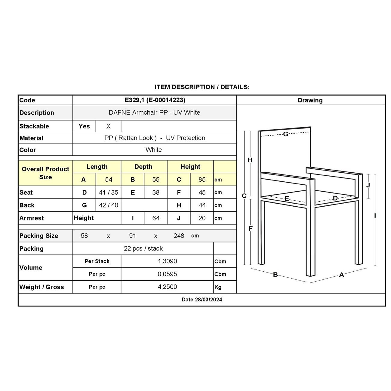 DAFNE Πολυθρόνα Τραπεζαρίας Κήπου Στοιβαζόμενη, PP Rattan Look UV Protection, Άσπρo (Ε-00014223)