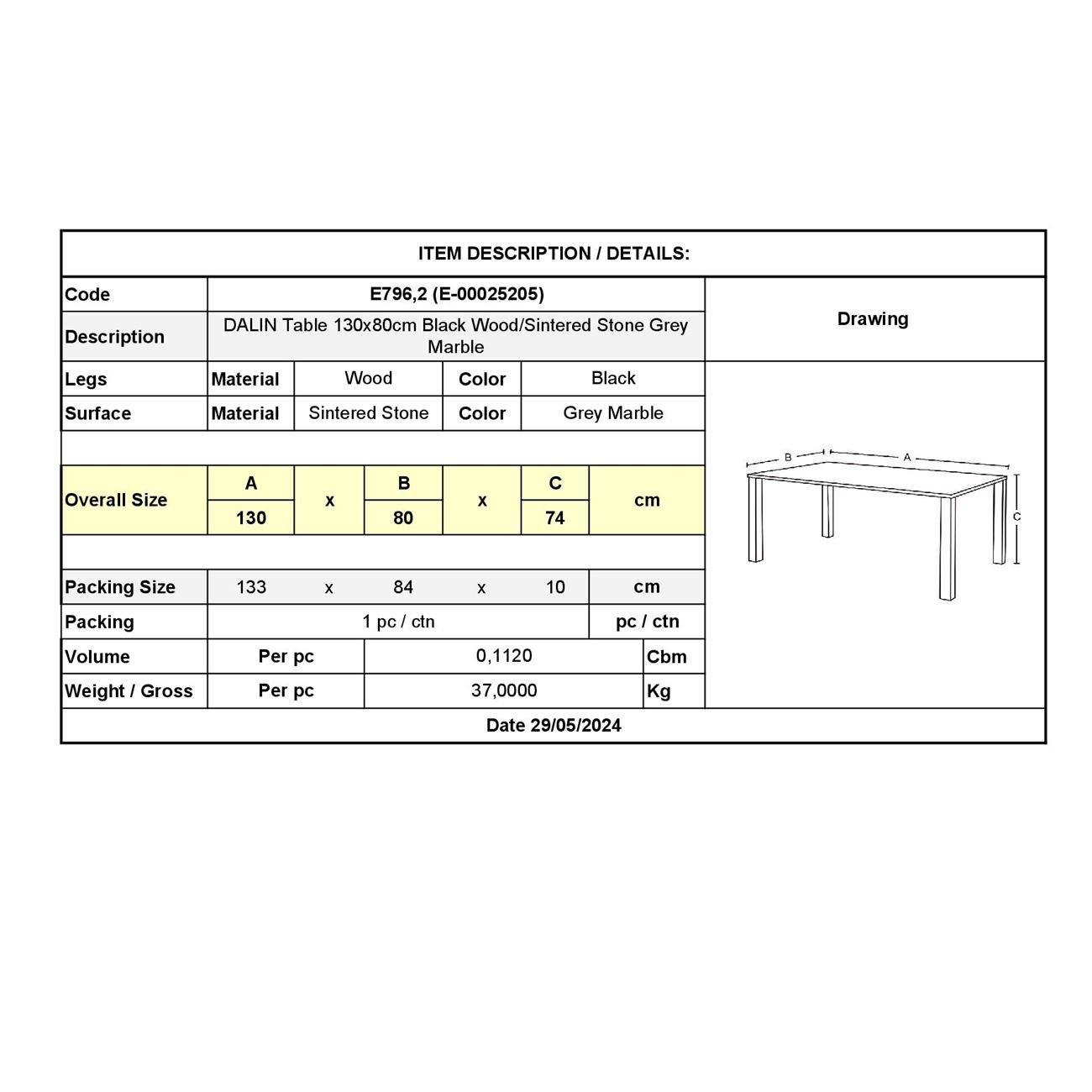 DALIN Τραπέζι Τραπεζαρίας- Κουζίνας, Ξύλο Μαύρο-Επιφάνεια Sintered Stone Grey Marble 130x80x74cm