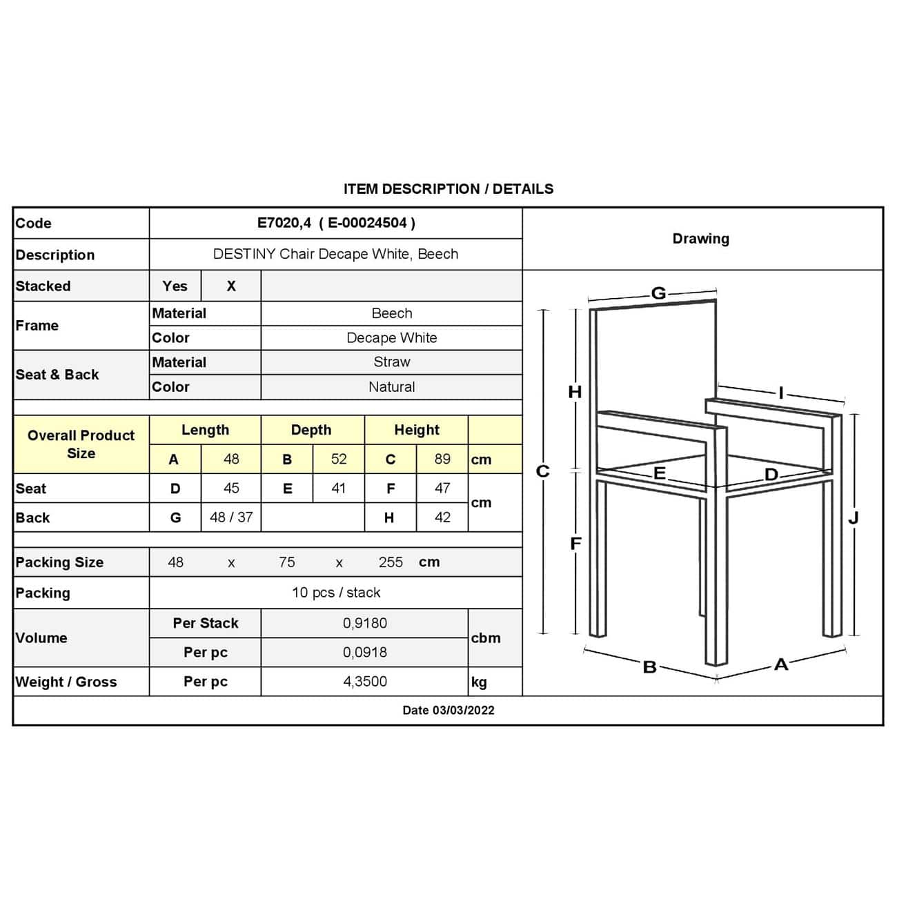 DESTINY Καρέκλα Τραπεζαρίας Οξιά Απόχρωση Decape Άσπρο, Κάθισμα Ψάθα, Στοιβαζόμενη (Ε-00024504)