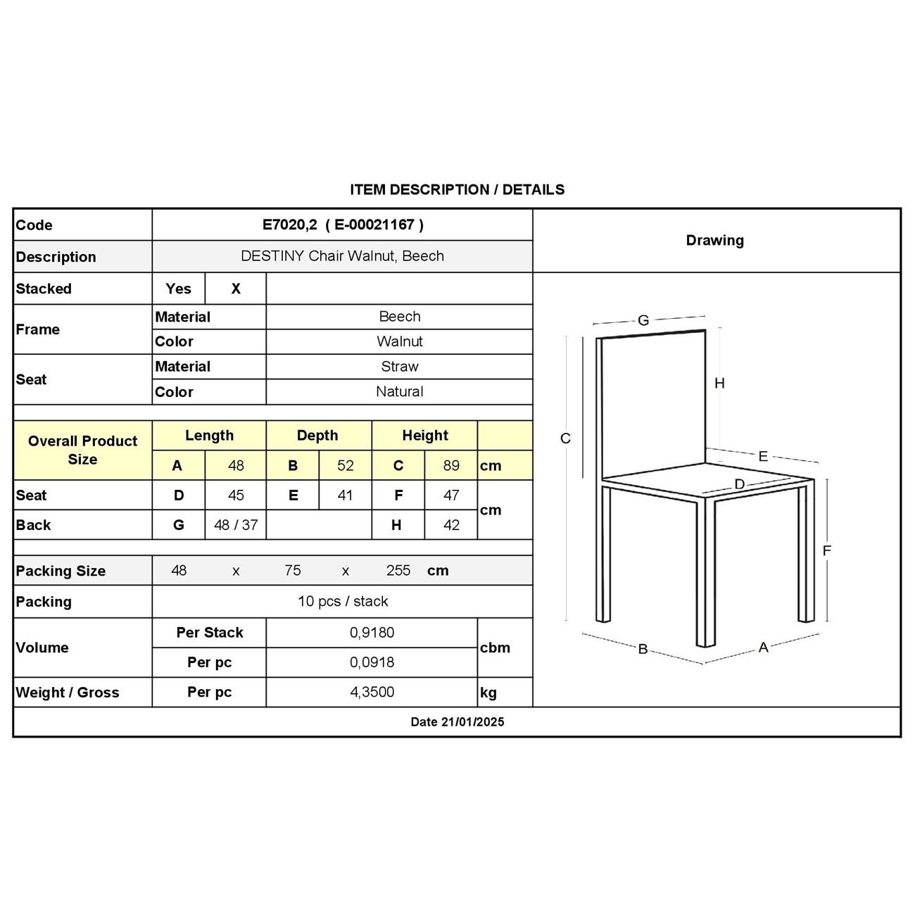DESTINY Καρέκλα Τραπεζαρίας Οξιά Καρυδί, Κάθισμα Ψάθα, Στοιβαζόμενη 48x52x89cm