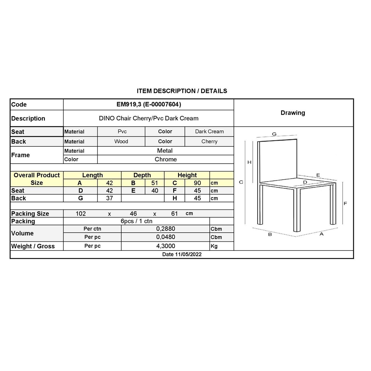 DINO Καρέκλα Τραπεζαρίας Κουζίνας, Μέταλλο Χρώμιο Κερασί, Pvc Εκρού 42x51x90cm