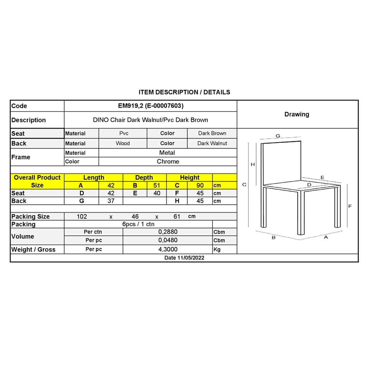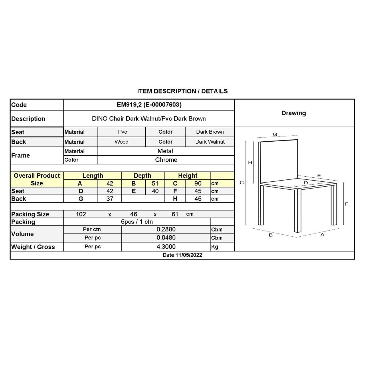 DINO Καρέκλα Τραπεζαρίας Κουζίνας, Μέταλλο Χρώμιο Σκούρο Καρυδί, PVC Καφέ 42x51x90cm