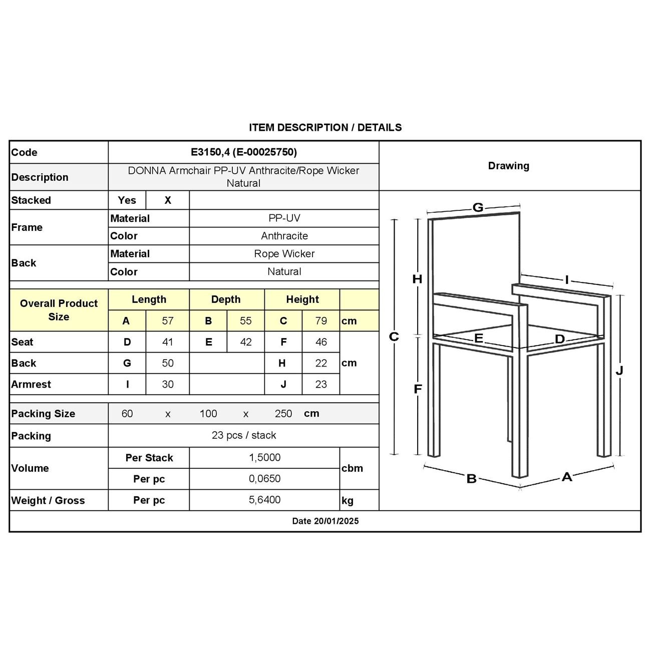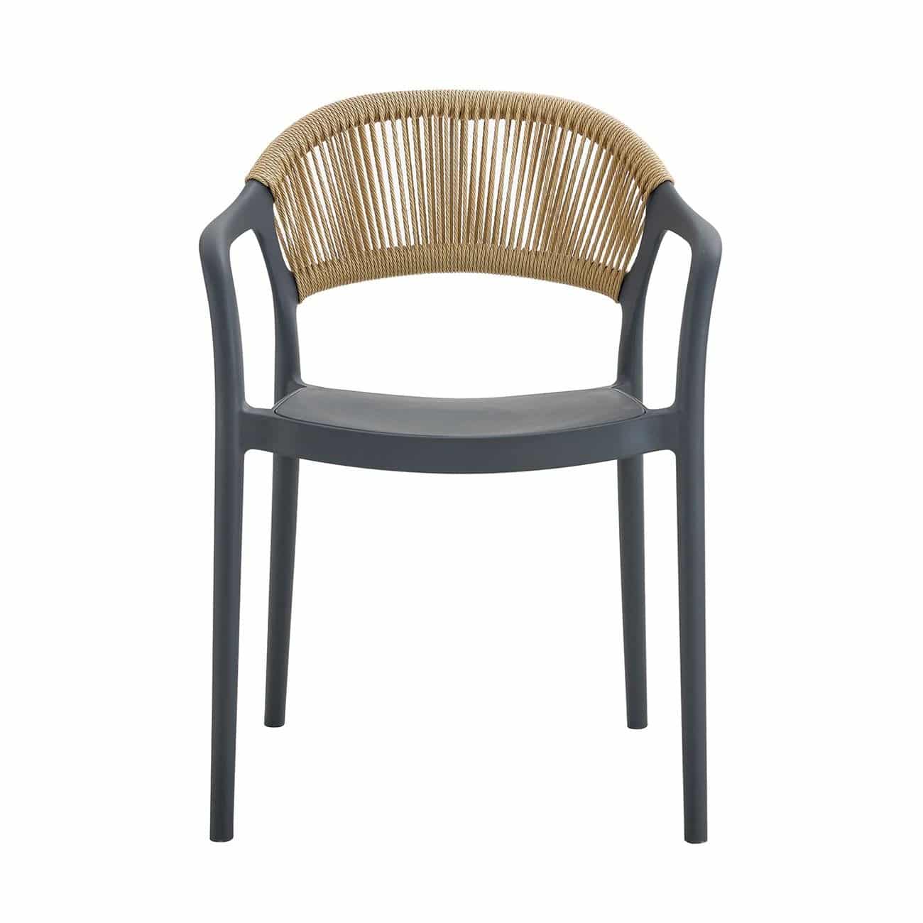 DONNA Πολυθρόνα-Pro Στοιβαζόμενη, PP-UV Ανθρακί, Rope Wicker Φυσικό  (Ε-00025750)