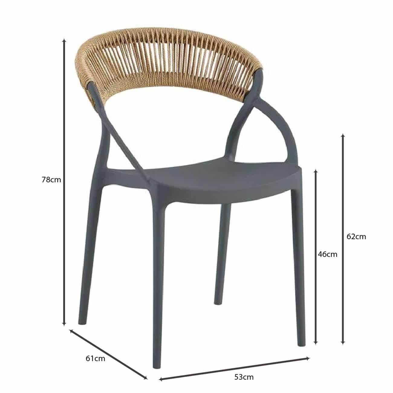 DORA Πολυθρόνα Στοιβαζόμενη, PP Ανθρακί, Rope Wicker Φυσικό 53x61x78cm